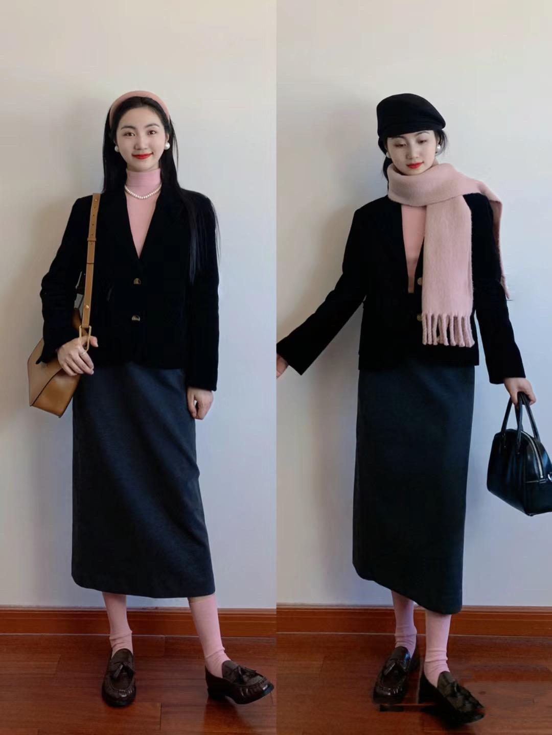 粉色+黑色,是一種既高級又溫柔的配色。不管是黑色套裙、還是黑色大衣,都可以配粉色打底衫來穿着。粉色打底衫作爲內搭,柔和又雅緻,更多了女性的溫情與浪漫。