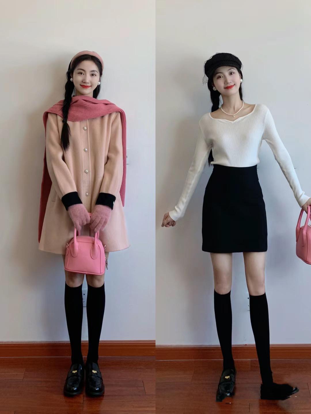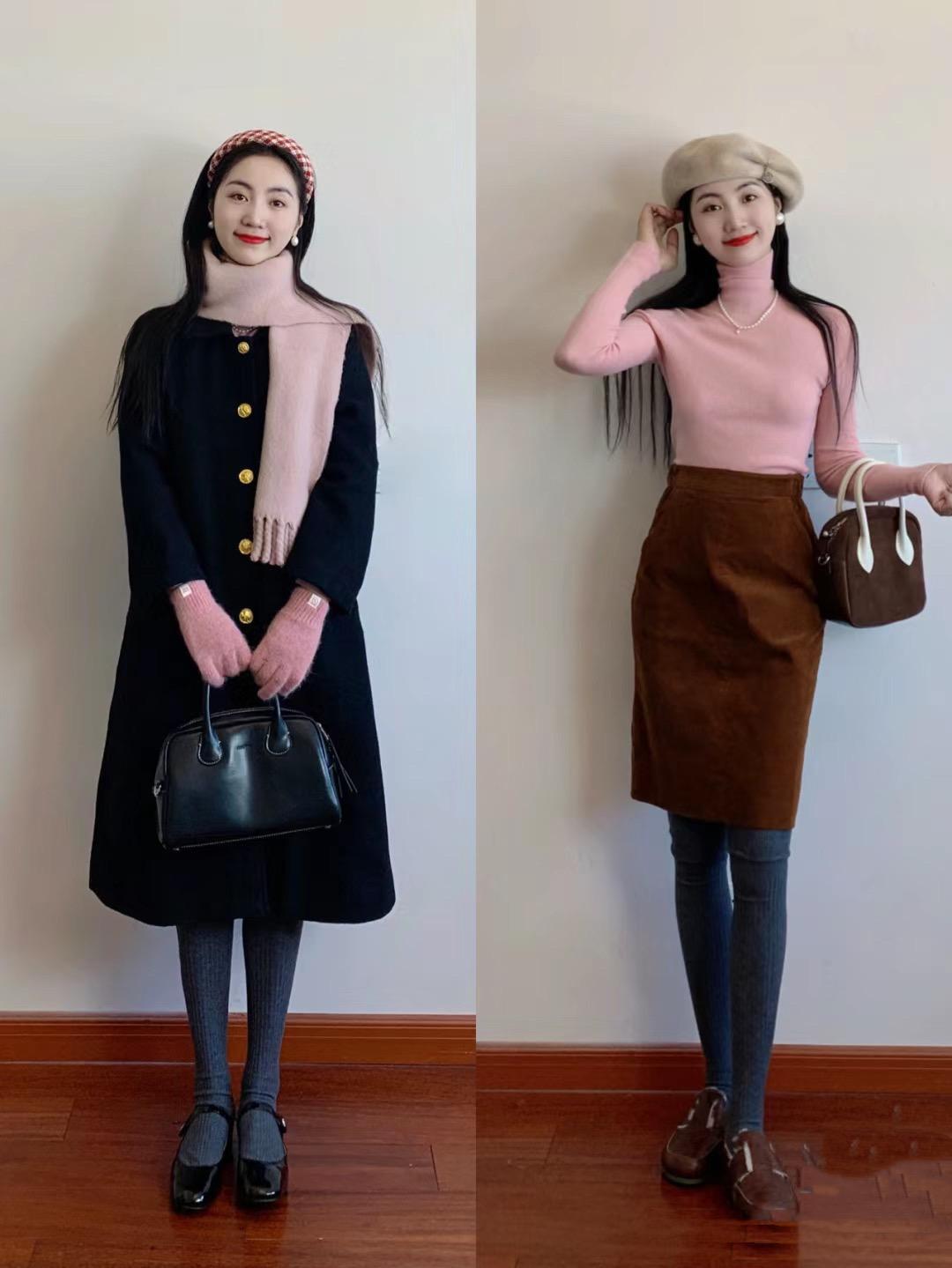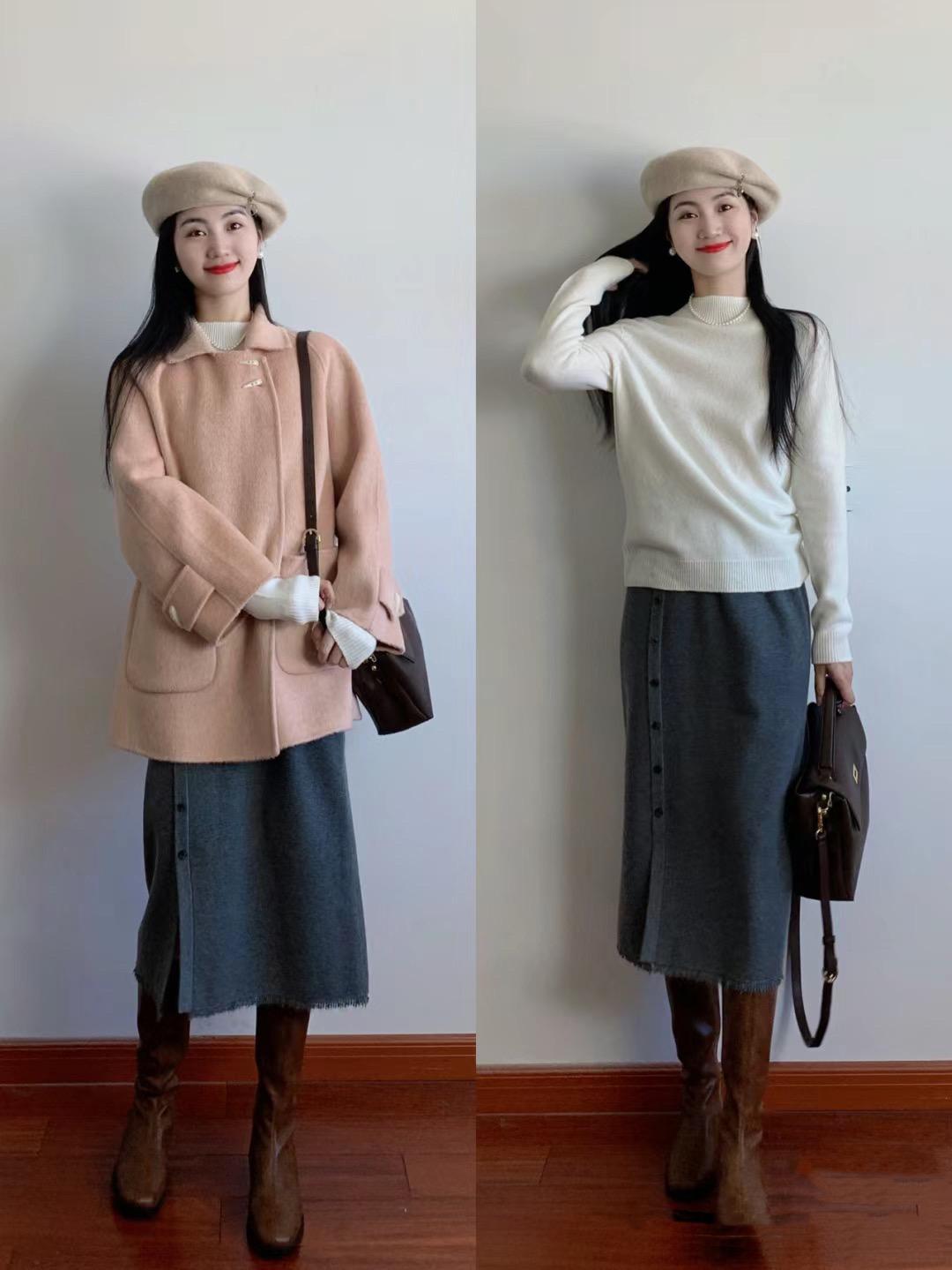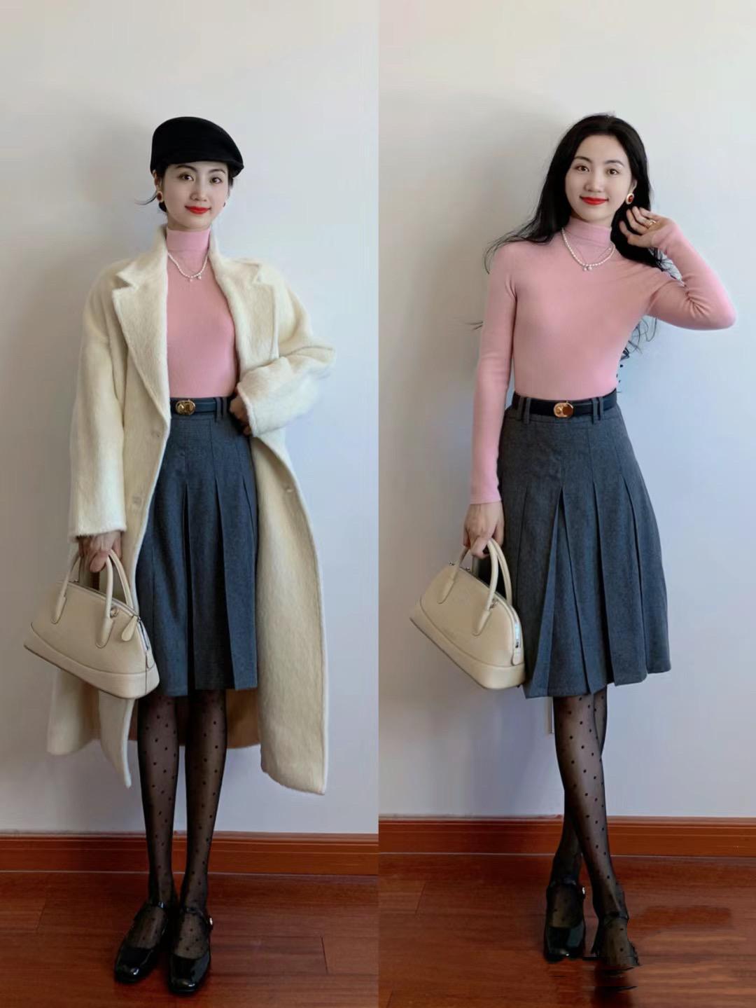 我們可以嘗試用粉色毛呢外套搭配修身的半高領打底衫,這種基礎款的白色半高領打底衫,穿起來就格外的溫柔。配高腰的半身裙,也是體面又大氣的。
