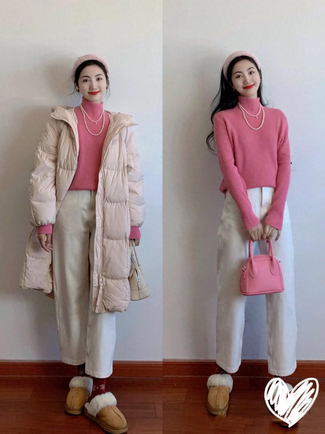 粉色系的棉服,可以搭配半高領的打底衫,鬆緊對比的輪廓體面又大方。一條白色闊腿褲,不僅與半高領打底衫形成縱向線條的延伸,還呈現出修長的“大長腿”。