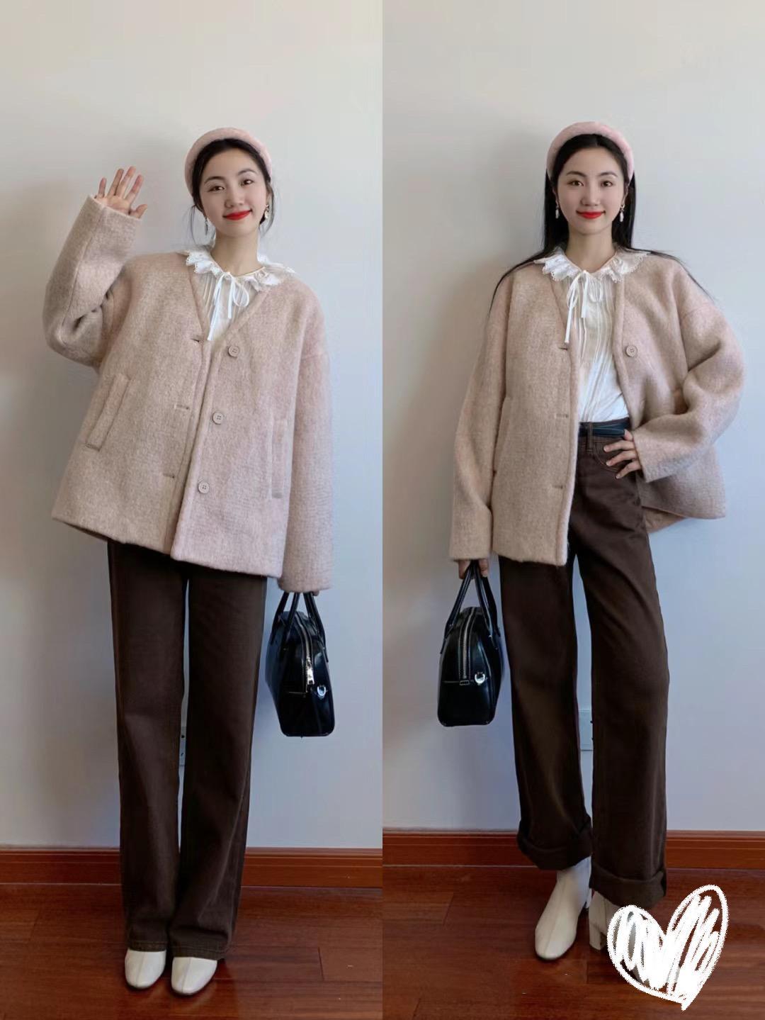裸粉色的毛呢外套,色彩亮度沒有那麼高,穿起來更加雅緻一些。像這種裸粉色,有點類似肉桂粉的顏色,柔和大方、一點都不挑人。
