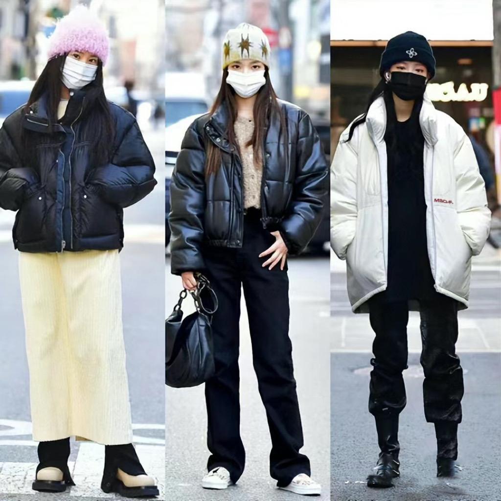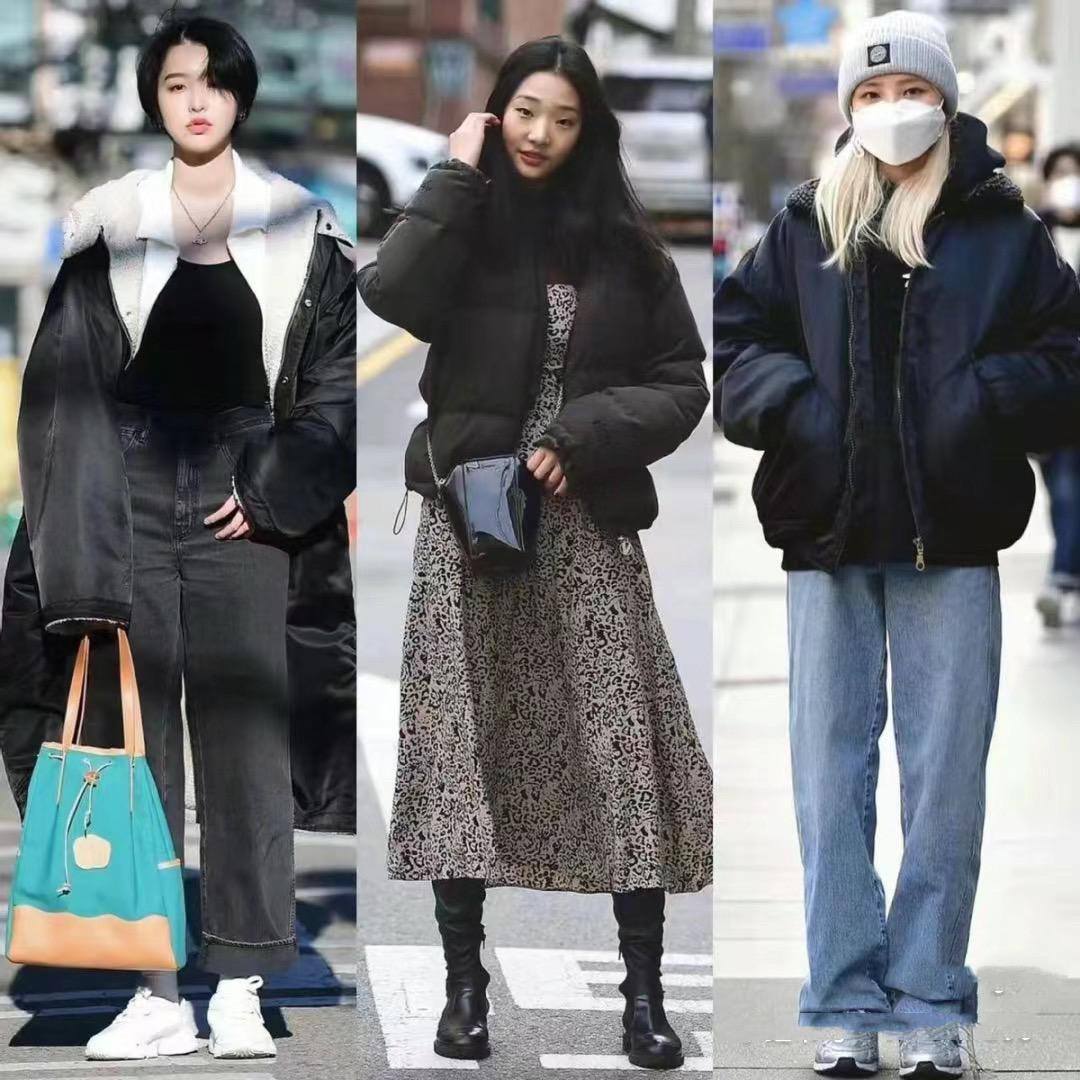 短款羽絨服+高腰的黑色直筒褲