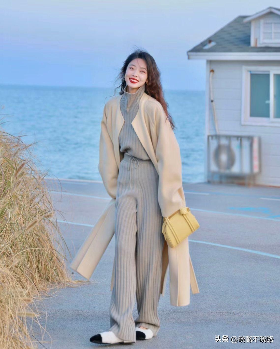 並且上短下長作爲內搭而進行呈現的時候,這一套的穿搭也有一個重點就是下半身無論是選擇裙裝還是褲裝,最好都是可以與長款大衣在長短當中有所層次對比的效果而存在的,這樣的話針對於整個下半身而言都是可以起到很明顯的拉長拉伸的效應。