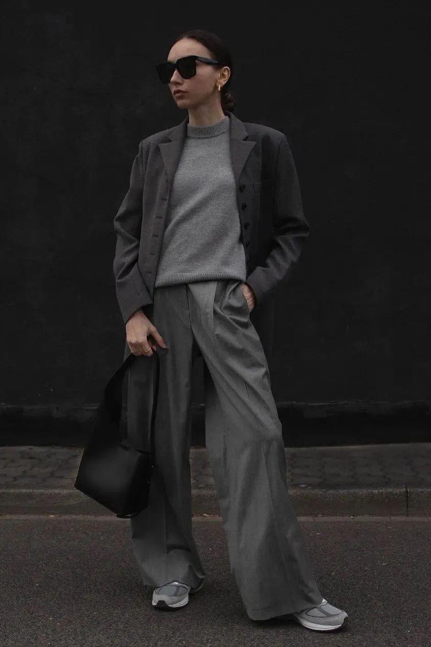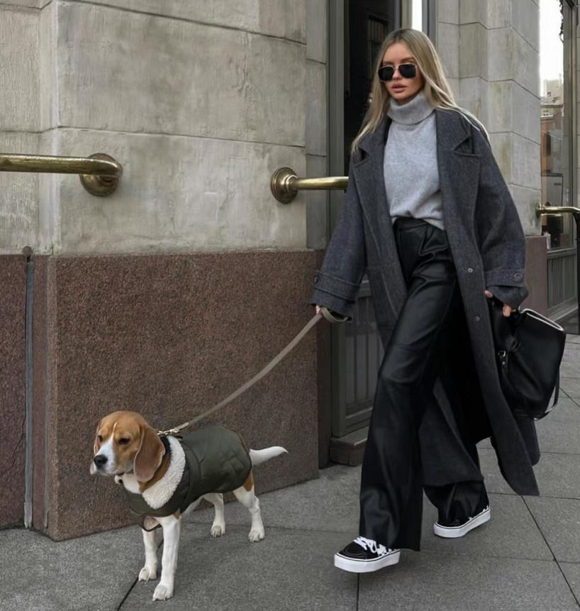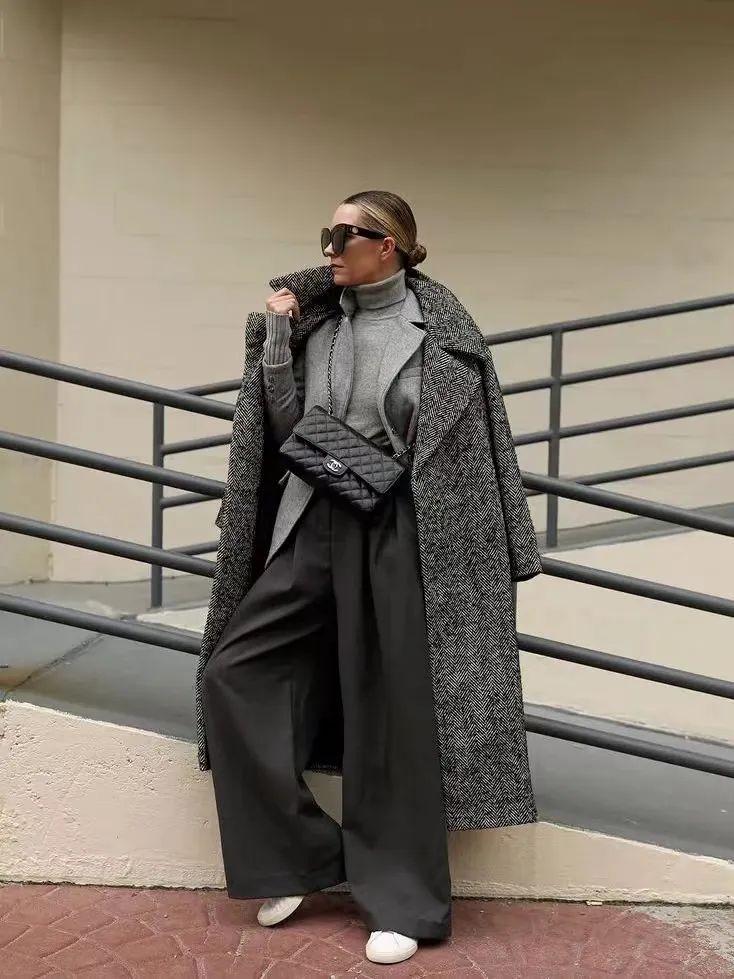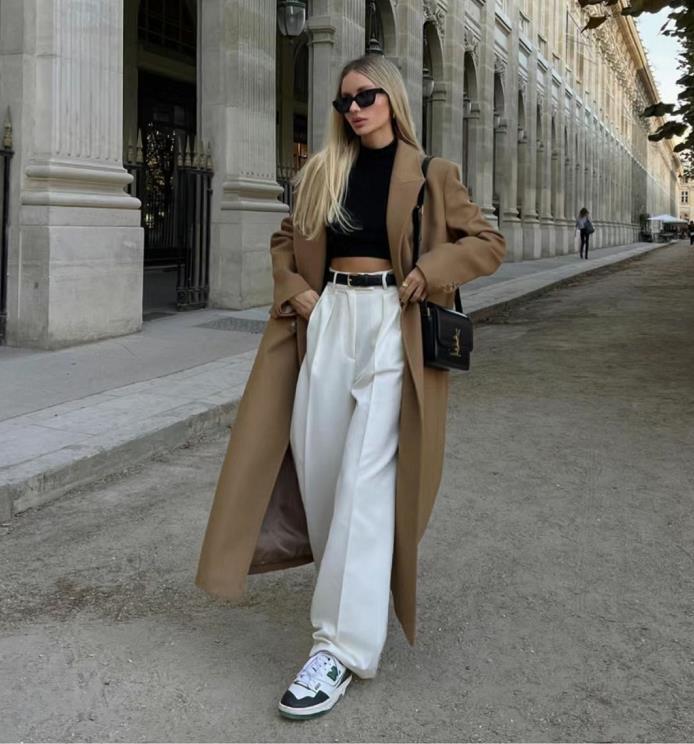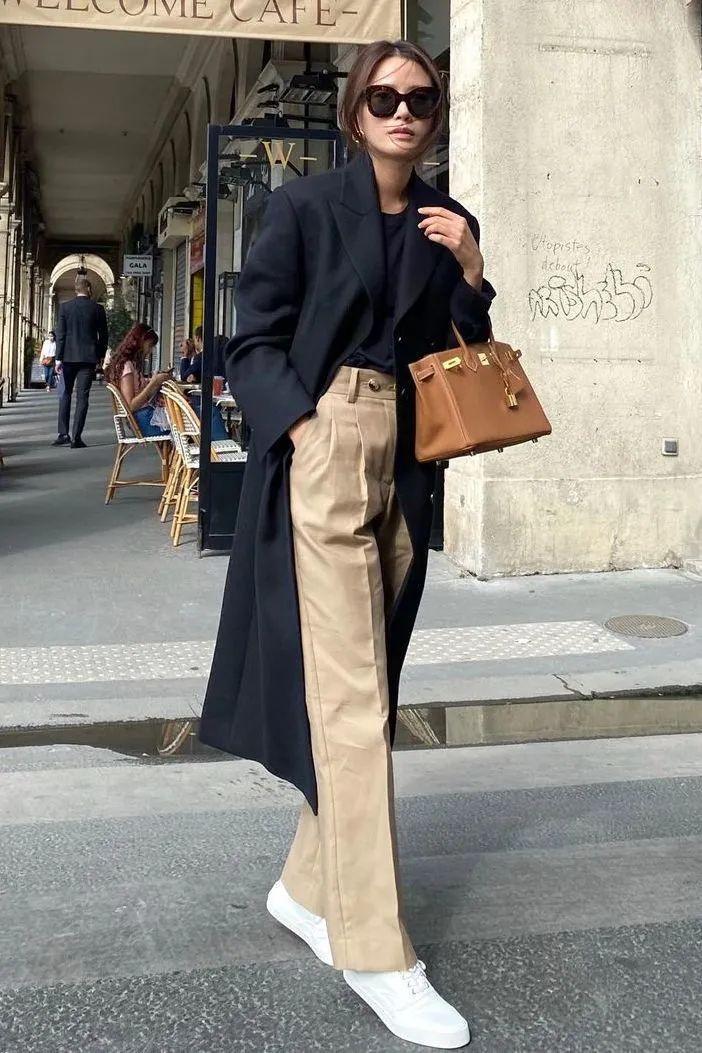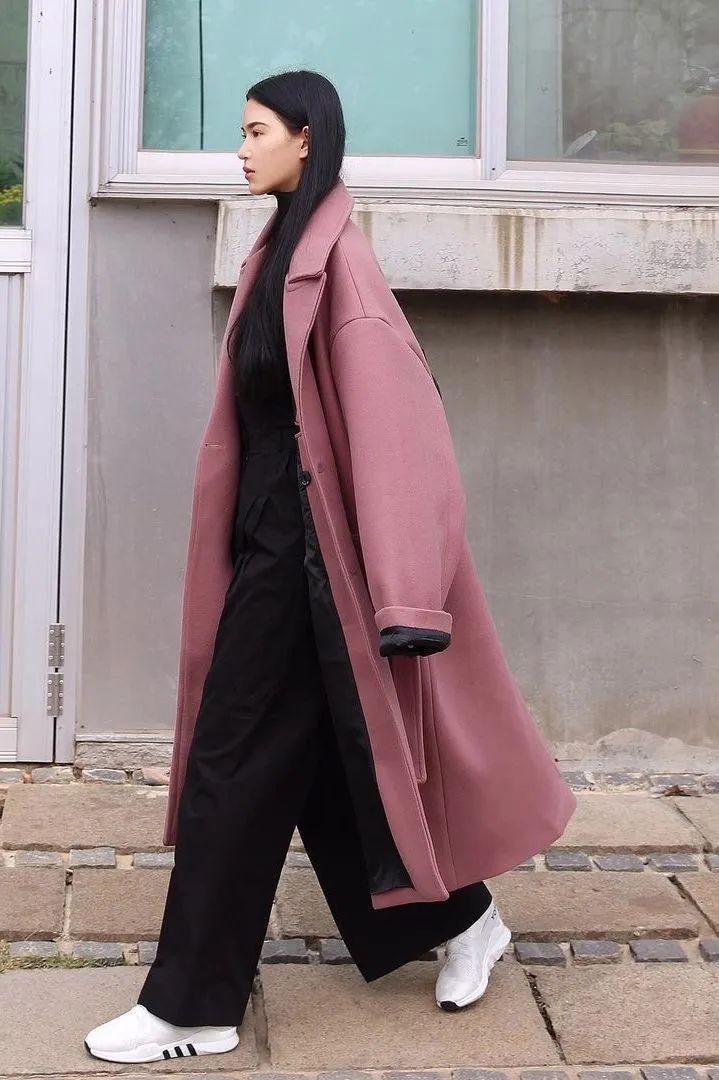 長大衣+闊腿褲可是能打造出強大氣場的,混搭休閒鞋或運動鞋就可以。