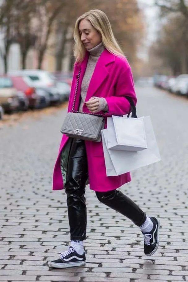 有些女生在冬季會喜歡選一些彩色的大衣,那麼這個時候搭配黑色運動鞋,整體的配色看起來就沒有那麼花哨。造型也大氣很多。