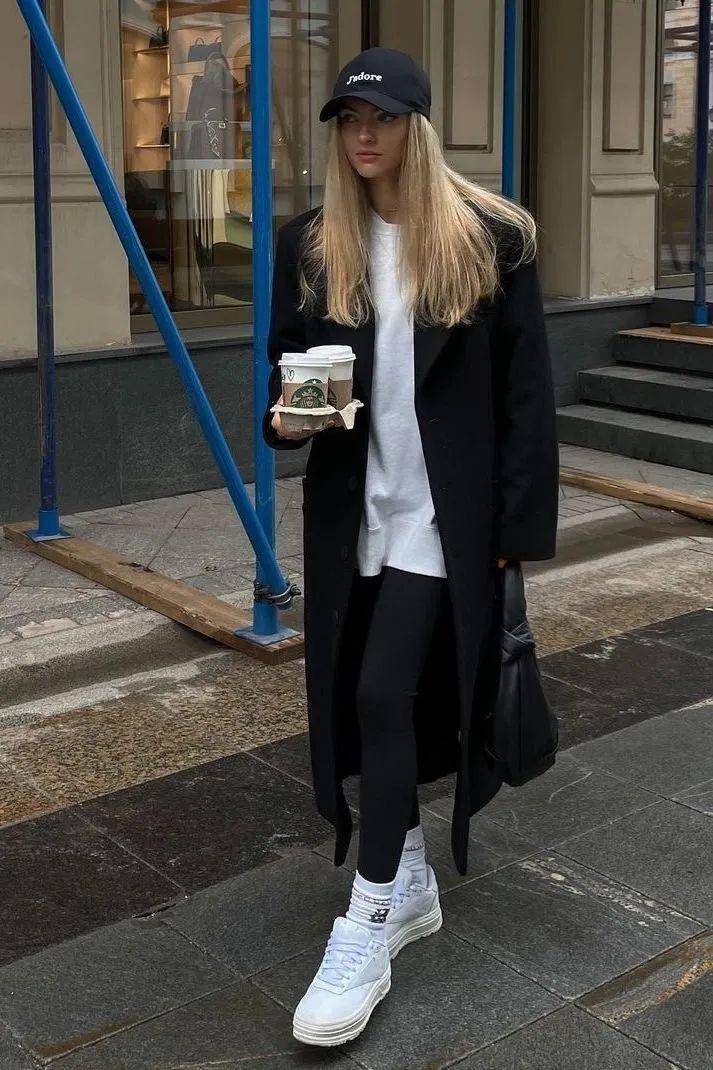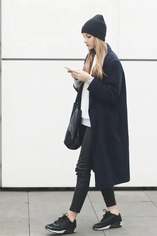 褲子和鞋子顏色一致,是很和諧時髦的穿法,大程度延長了腿部的線條。因此用小黑褲+黑色運動鞋,再搭配長大衣是不會出錯的王牌穿法。