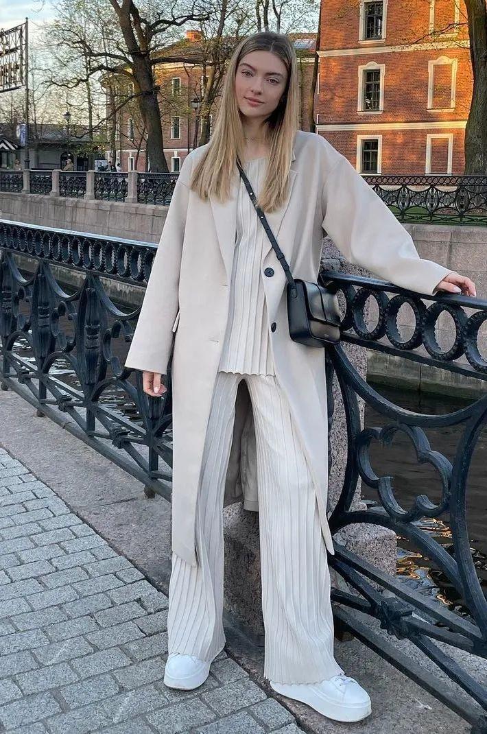 長大衣+運動鞋如何穿出顯高的效果?雖然這雙鞋子沒有高跟鞋那般自帶增高效果,但也可以利用一些技巧讓其實現高挑感。