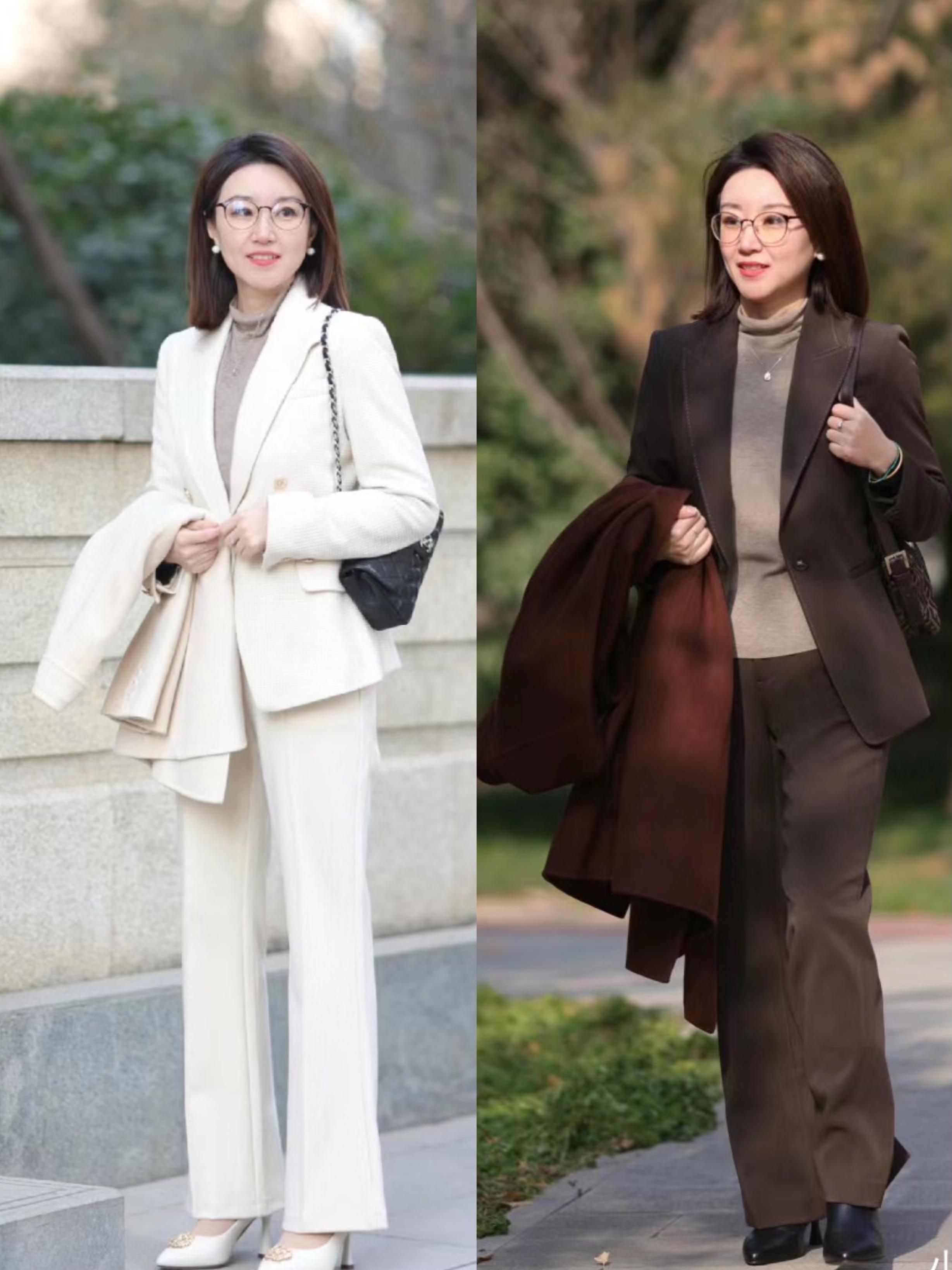 利落的西服套裝,配一雙高跟鞋、顯得身材挺拔。當我們選擇西服套裝的時候,也需要更加註重服裝質感。簡簡單單的搭配、也會體面舒適。
