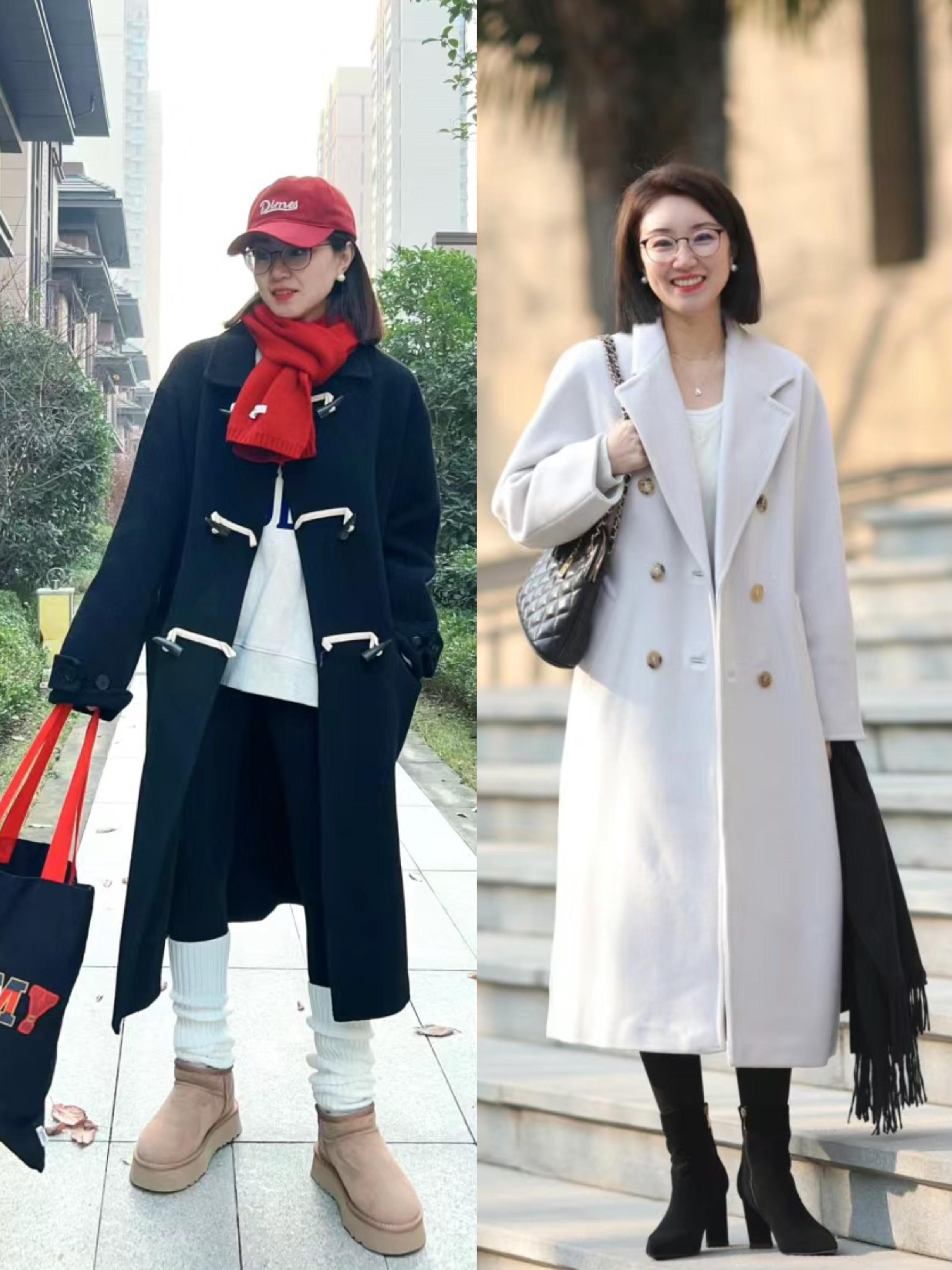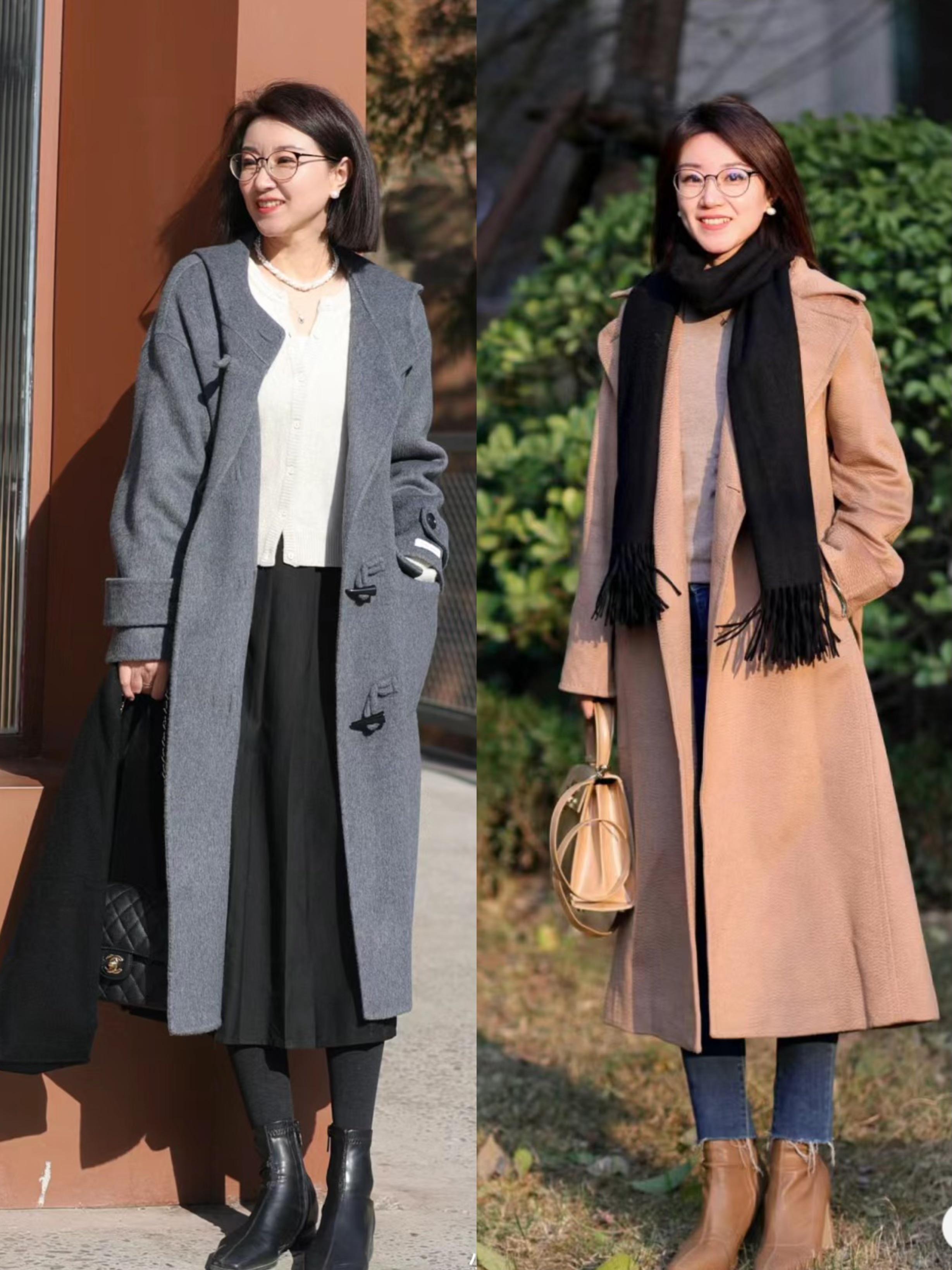 一件面料考究的毛呢大衣,穿起來也是優雅又體面。像這種米白色或者淺灰色的毛呢大衣,經典的雙排扣設計,大方基礎又溫柔甜美,40+也可以穿出少女範。