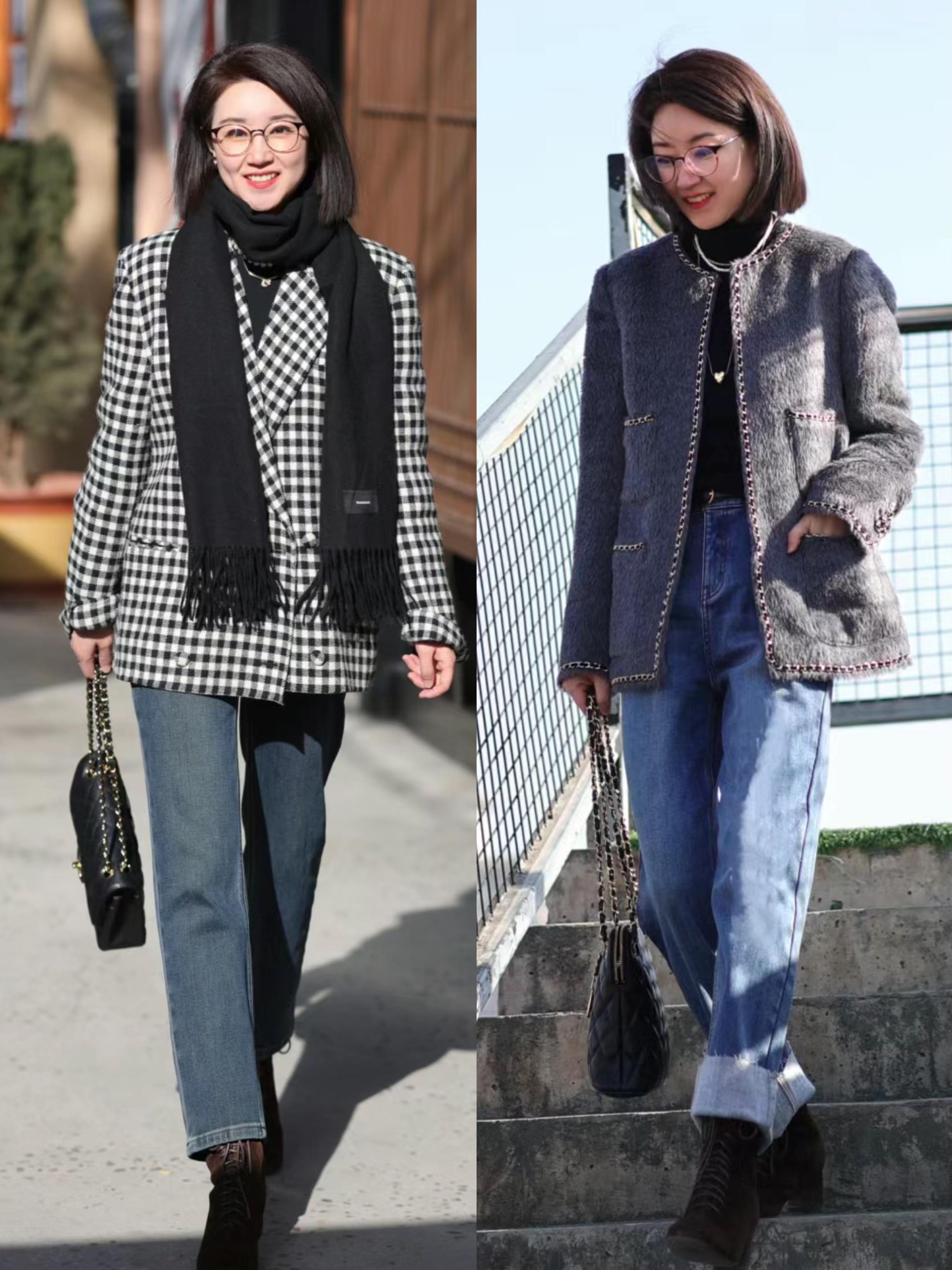 我們可以選擇H型的小香風外套,或者H型的毛呢大衣、羽絨服,用來搭配直筒的牛仔褲,簡單利落又顯腿長。像這種H型在直筒牛仔褲,配九分褲或者卷邊的設計,都很時髦。
