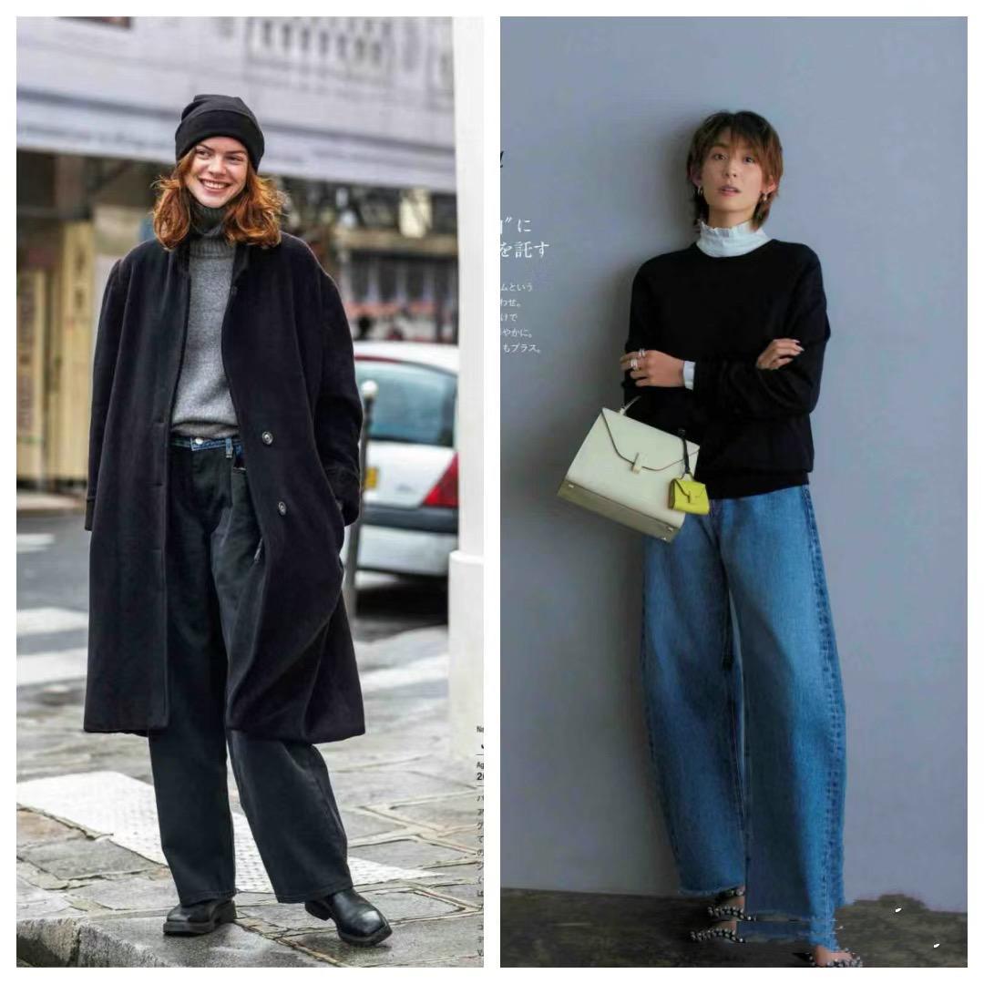 如果自己的身材比較輕盈,腿型也相對纖細的話,我們可以直接搭配修身的直筒牛仔褲。配深色系的款式,顯瘦效果也會更強。如果腰粗、胯寬、大腿粗,選擇闊腿牛仔褲就可以掩飾體型不足。
