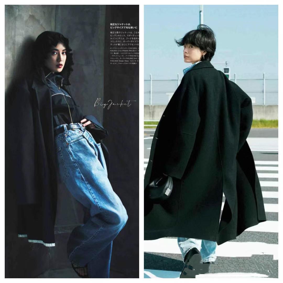 稍微寬鬆的黑色大衣,經典的款式又酷又美。像這種寬鬆的黑色大衣,配上稍微修身的直筒牛仔褲,可以呈現出鬆緊對比。稍微修身的直筒牛仔褲,配上厚底鞋又酷又美。