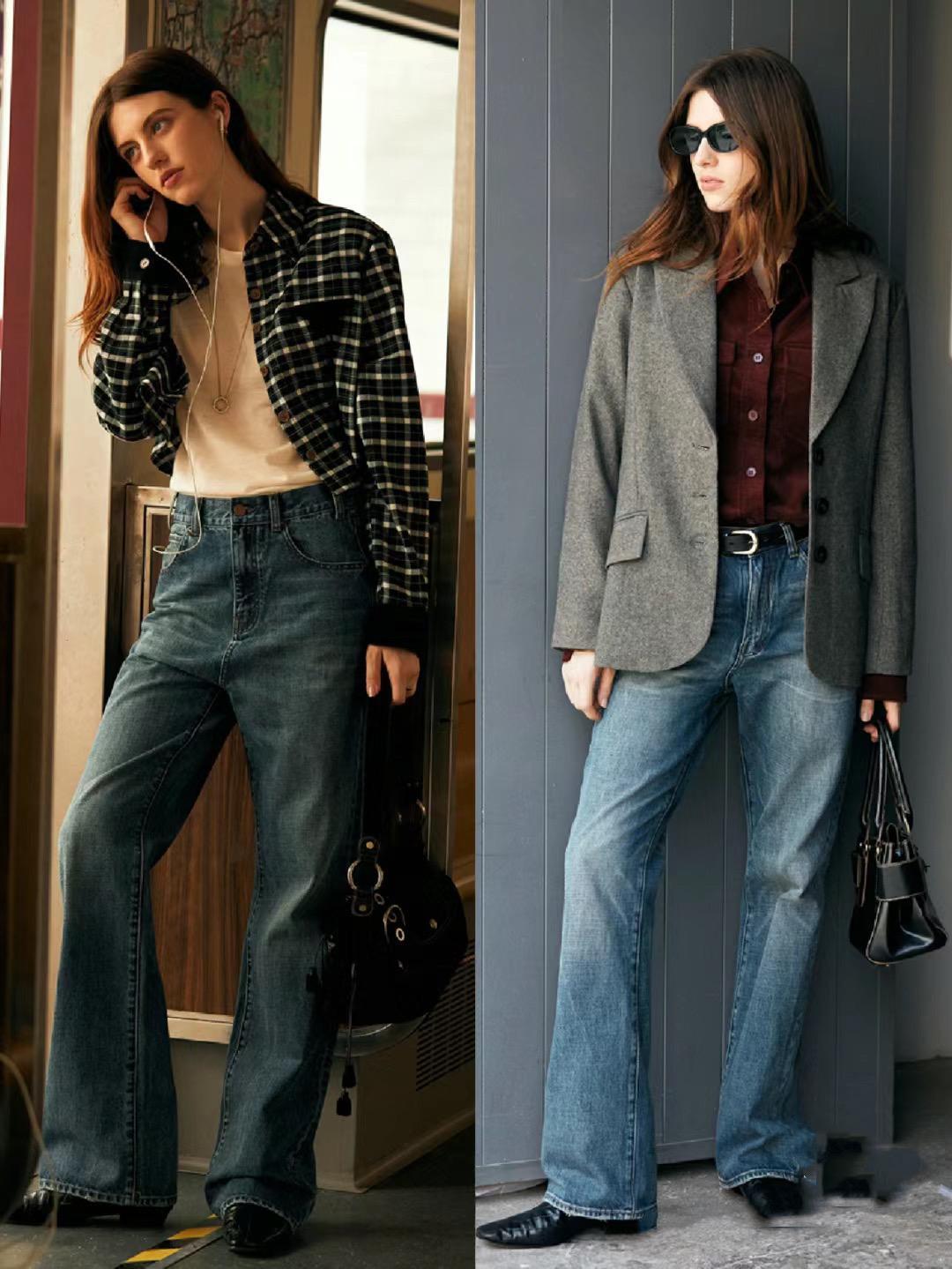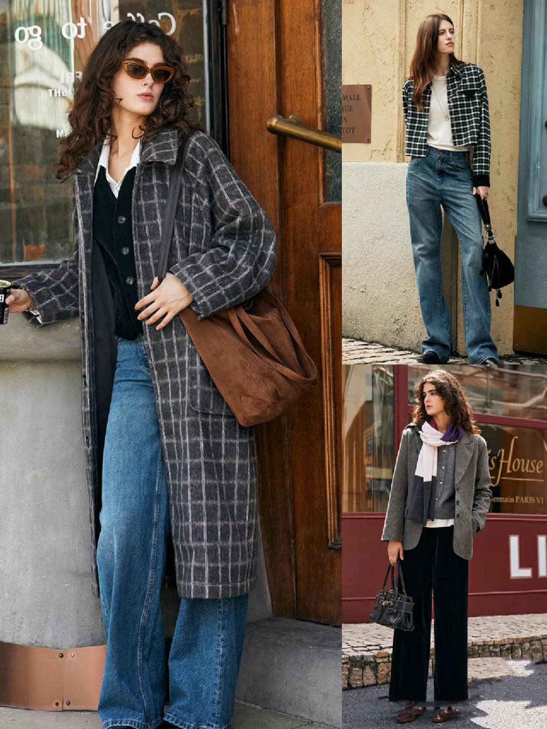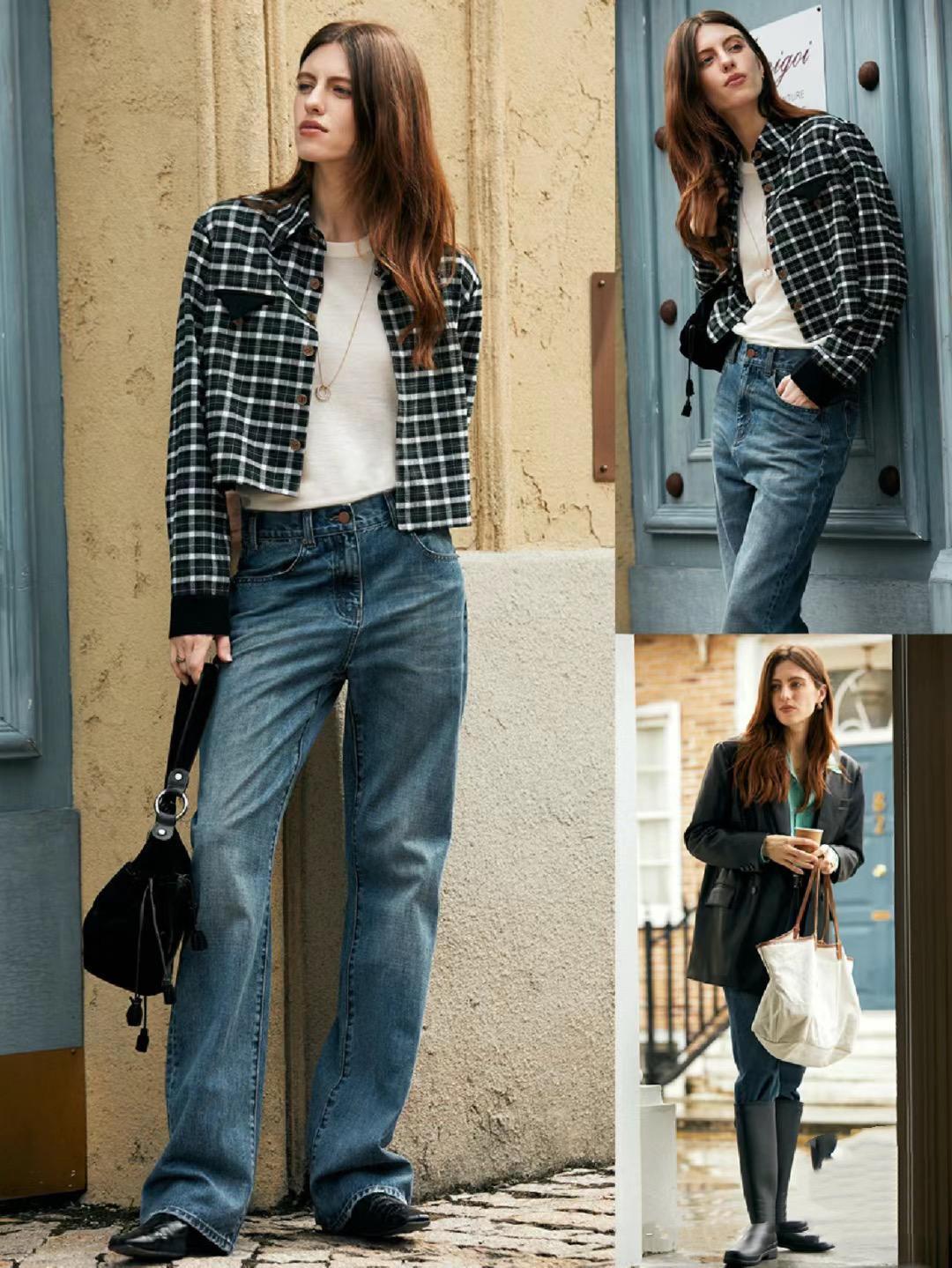 法式輕復古穿搭,也會更加註重身材氣質的呈現。短款的格子小外套+高腰的直筒牛仔褲,就可以讓我們的身材比例得到更自然的切分,三七比例更顯腿長。