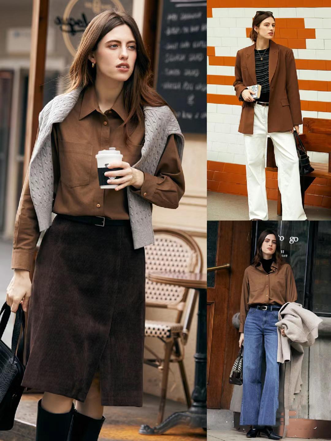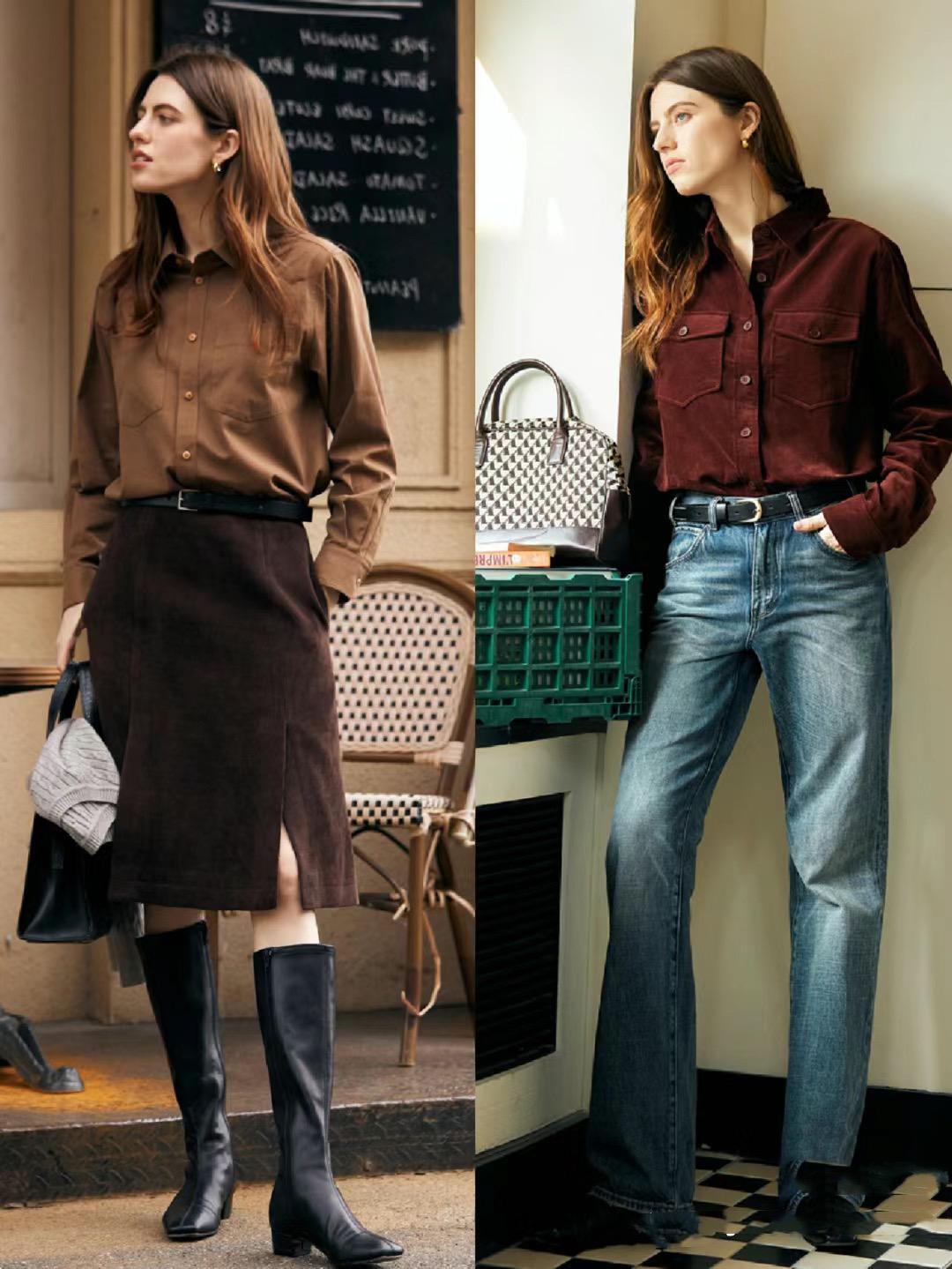 法式輕復古的穿搭,怎麼能少的了一抹濃郁熱烈的顏色呢。棕色系的條絨外套,自帶復古風情、穿起來優雅又大方。
