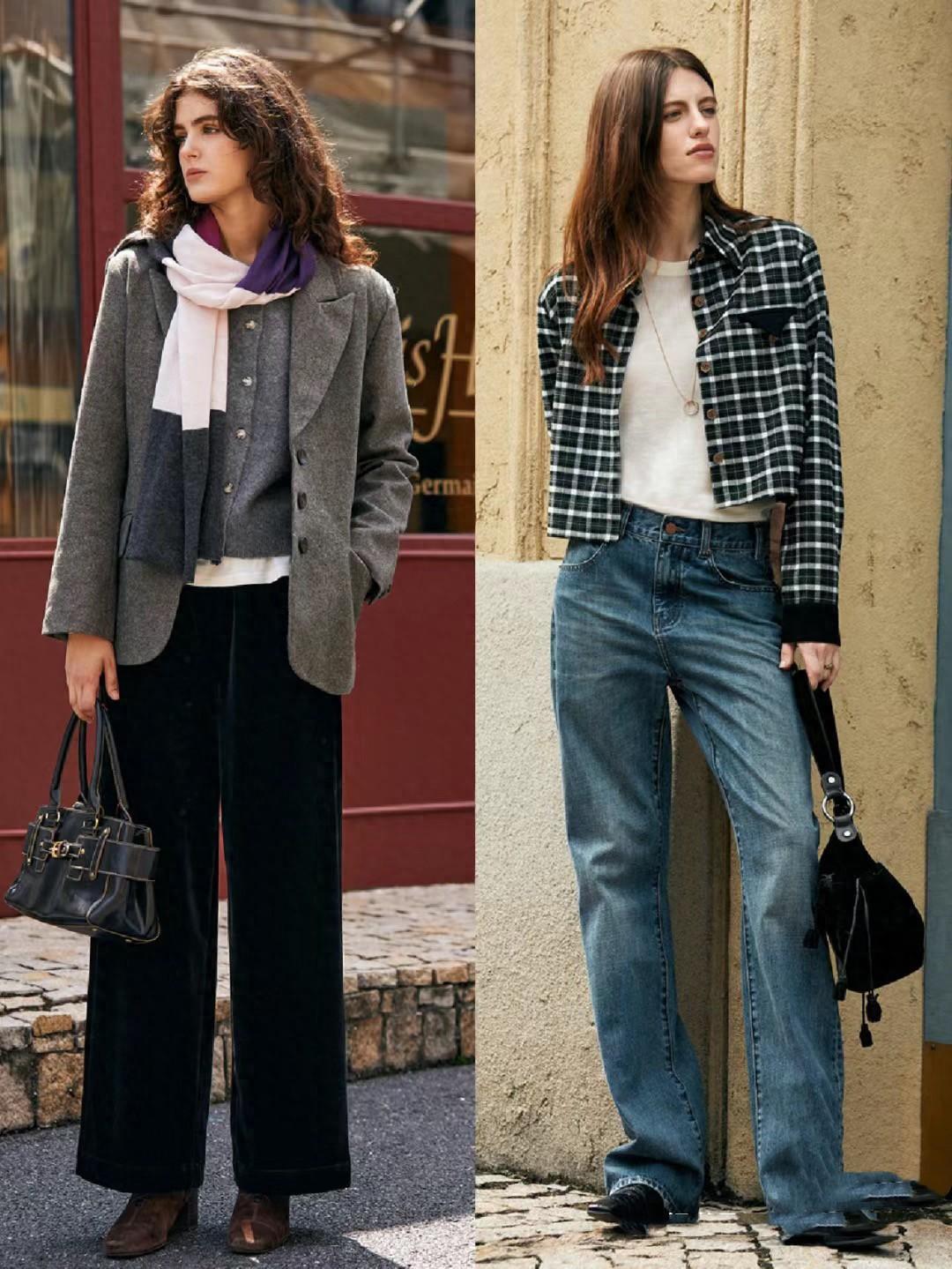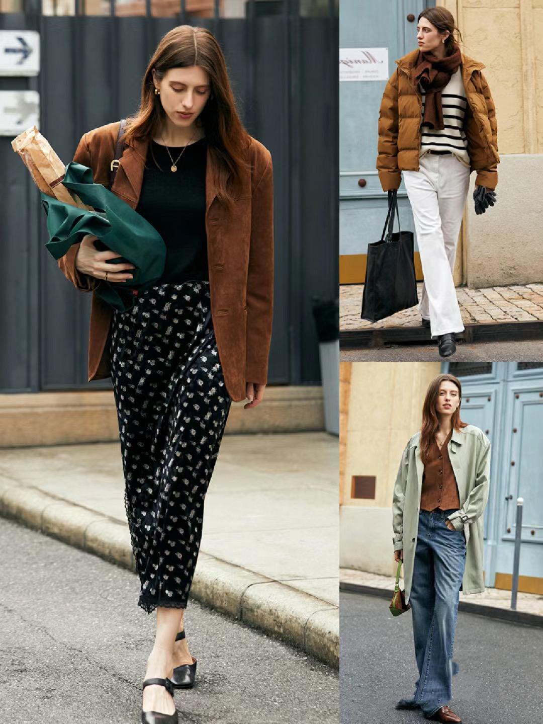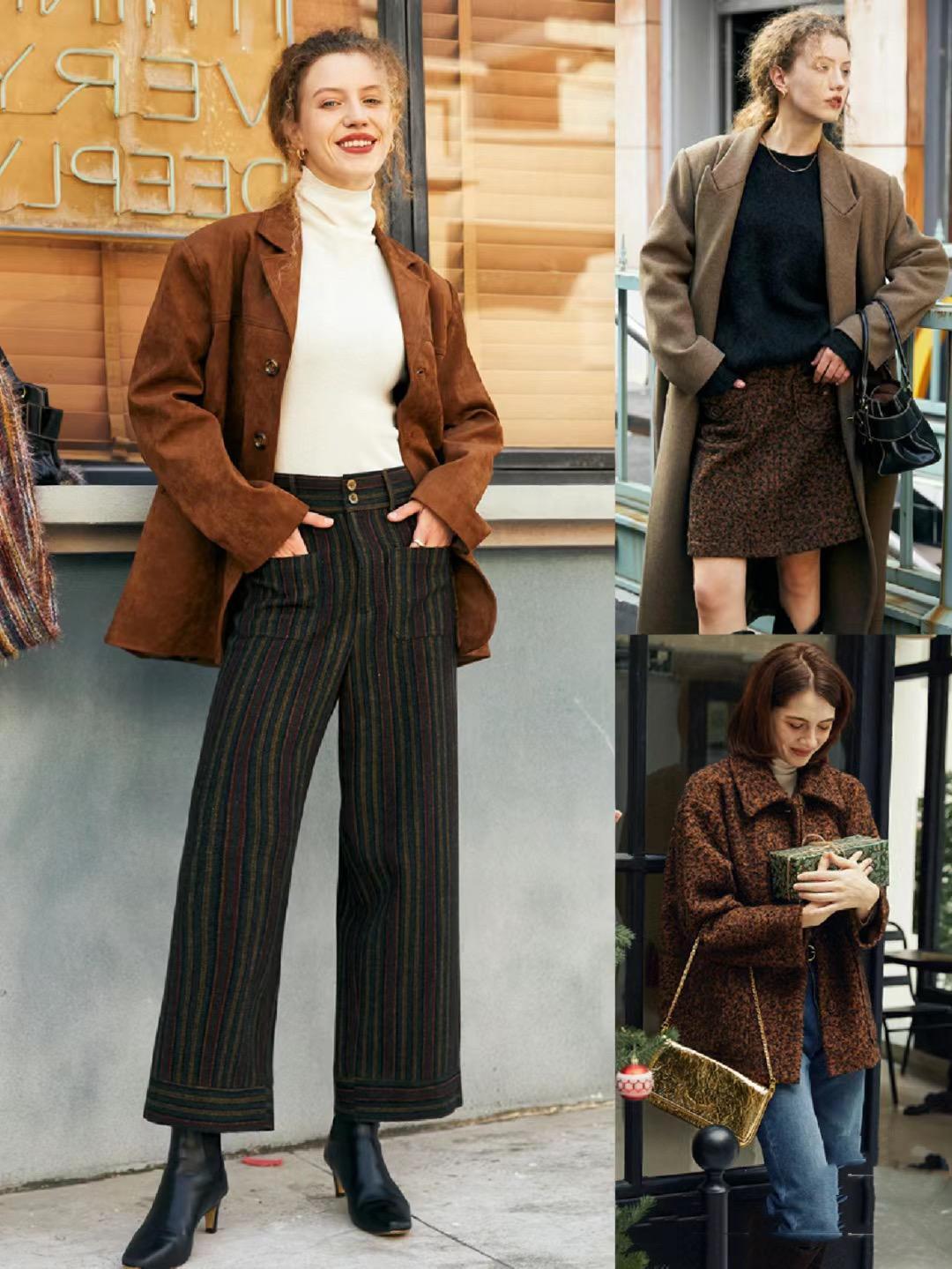 所謂法式輕復古穿搭,就是將優雅浪漫的法式風、與內斂深沉的復古風融合。服裝面料考究、細節精緻、款式大方,色彩以深色調、暖色調、高級色爲主,面料主要包括了粗花呢、毛呢、牛仔、棉麻等等。