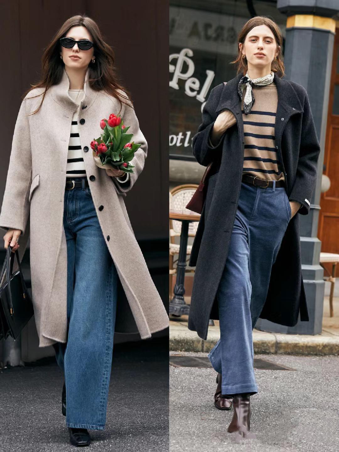 像這種黑灰色的格子大衣,我們疊搭V領針織衫+襯衫,層次清晰。一條闊腿牛仔褲的組合,呈現出更加率性拉風的美。尤其是梨型身材、或者下肢粗壯的人羣,都可以選擇高腰闊腿牛仔褲來修飾體型。