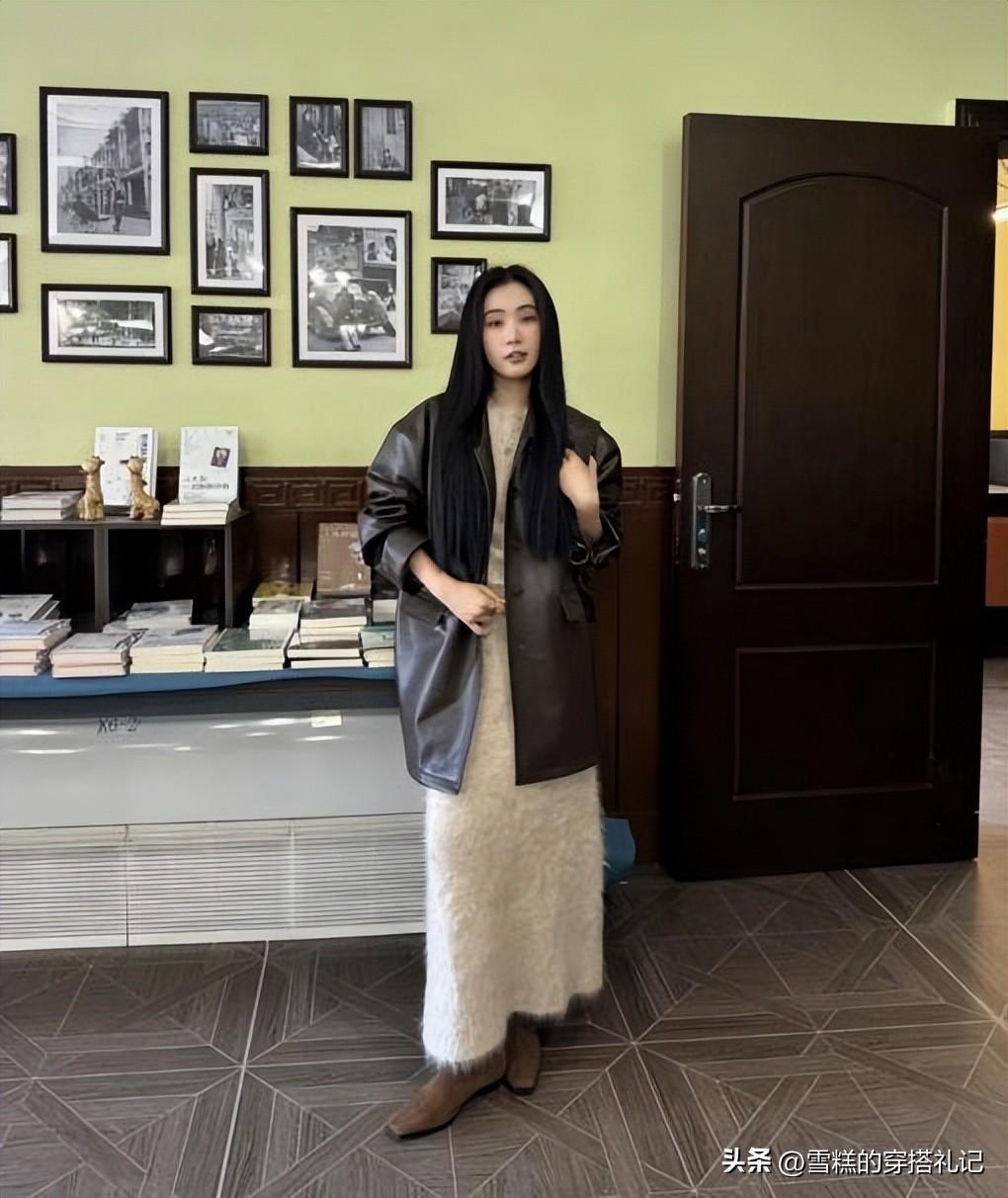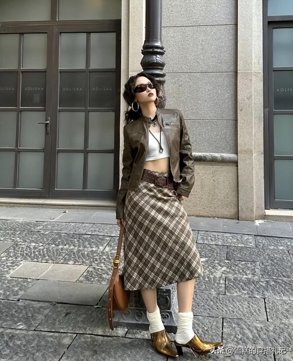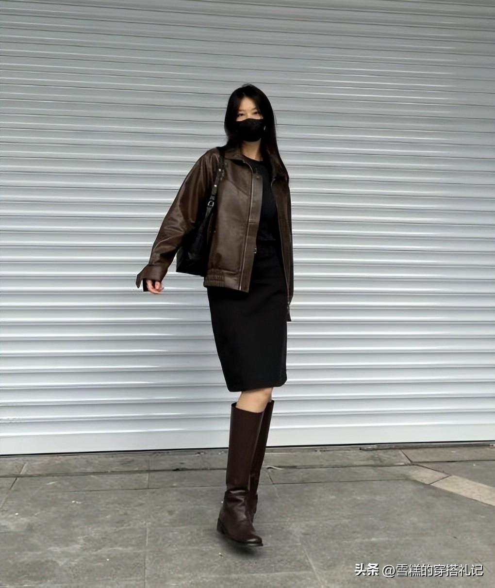 皮衣硬朗強勢,選擇用柔軟的針織裙與之搭配不僅能夠柔和穿搭整體讓氛圍更秋冬,另一方面因爲不同材質碰撞出來的層次感也更加高級,這一套很適合喜歡混搭的時髦女性們。