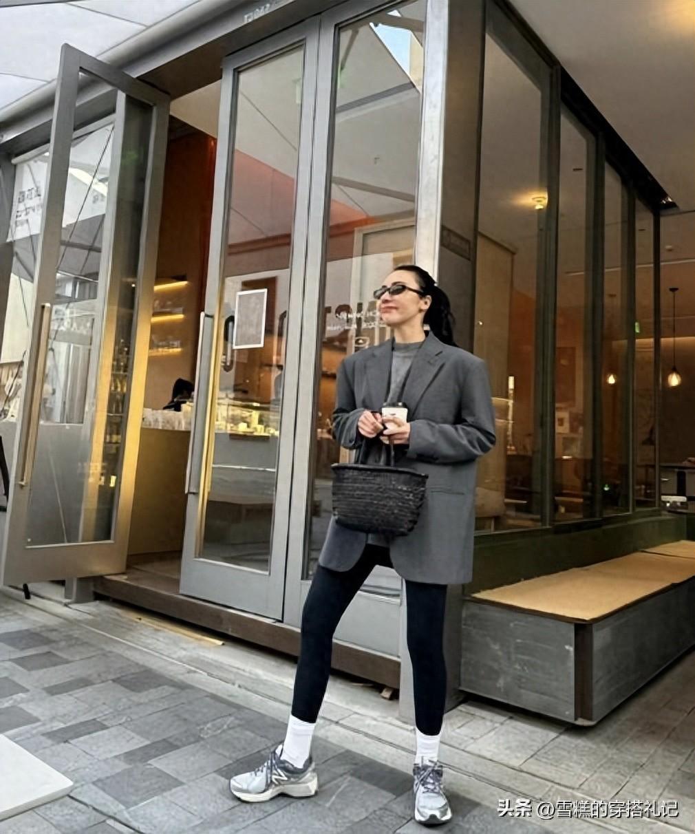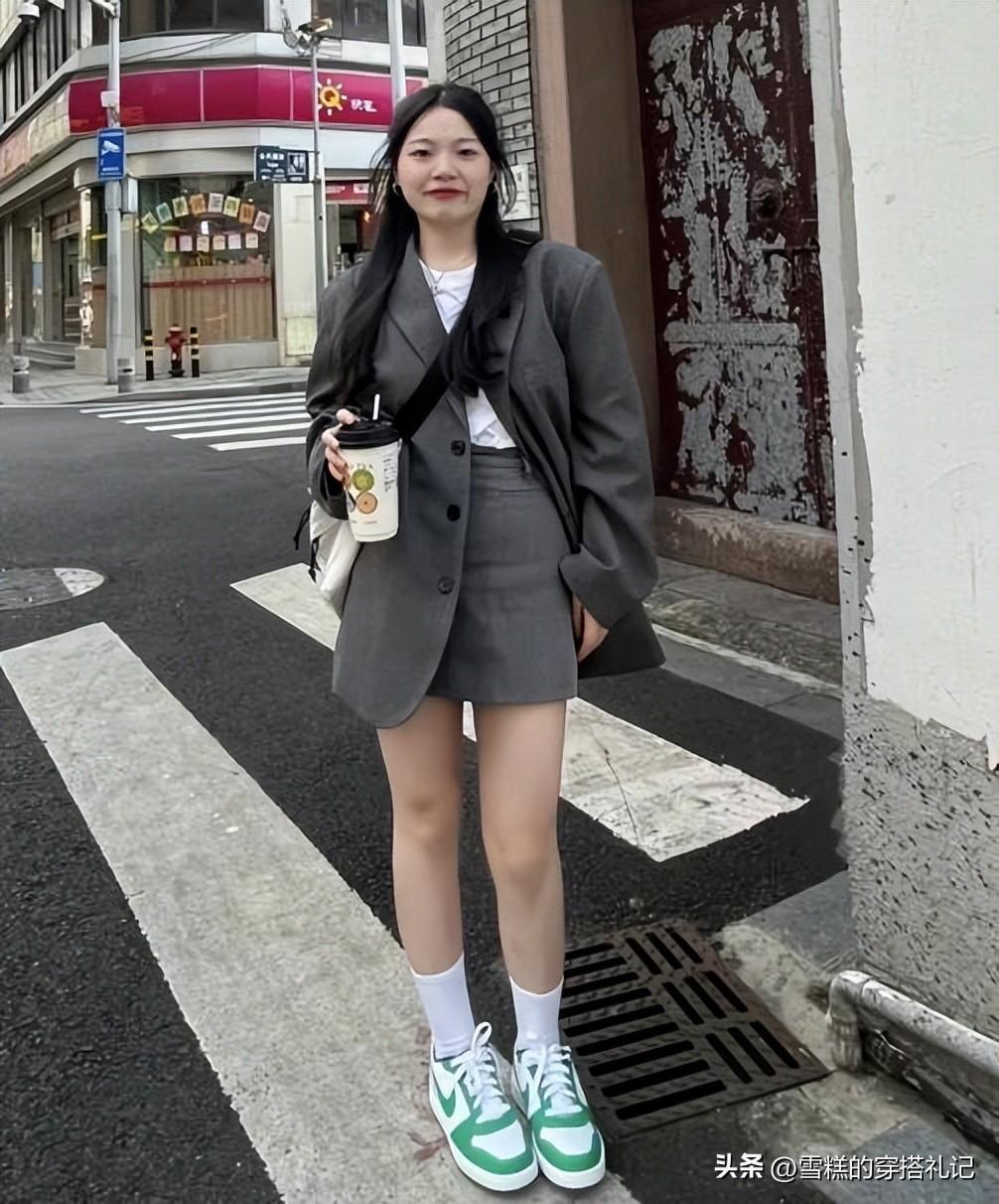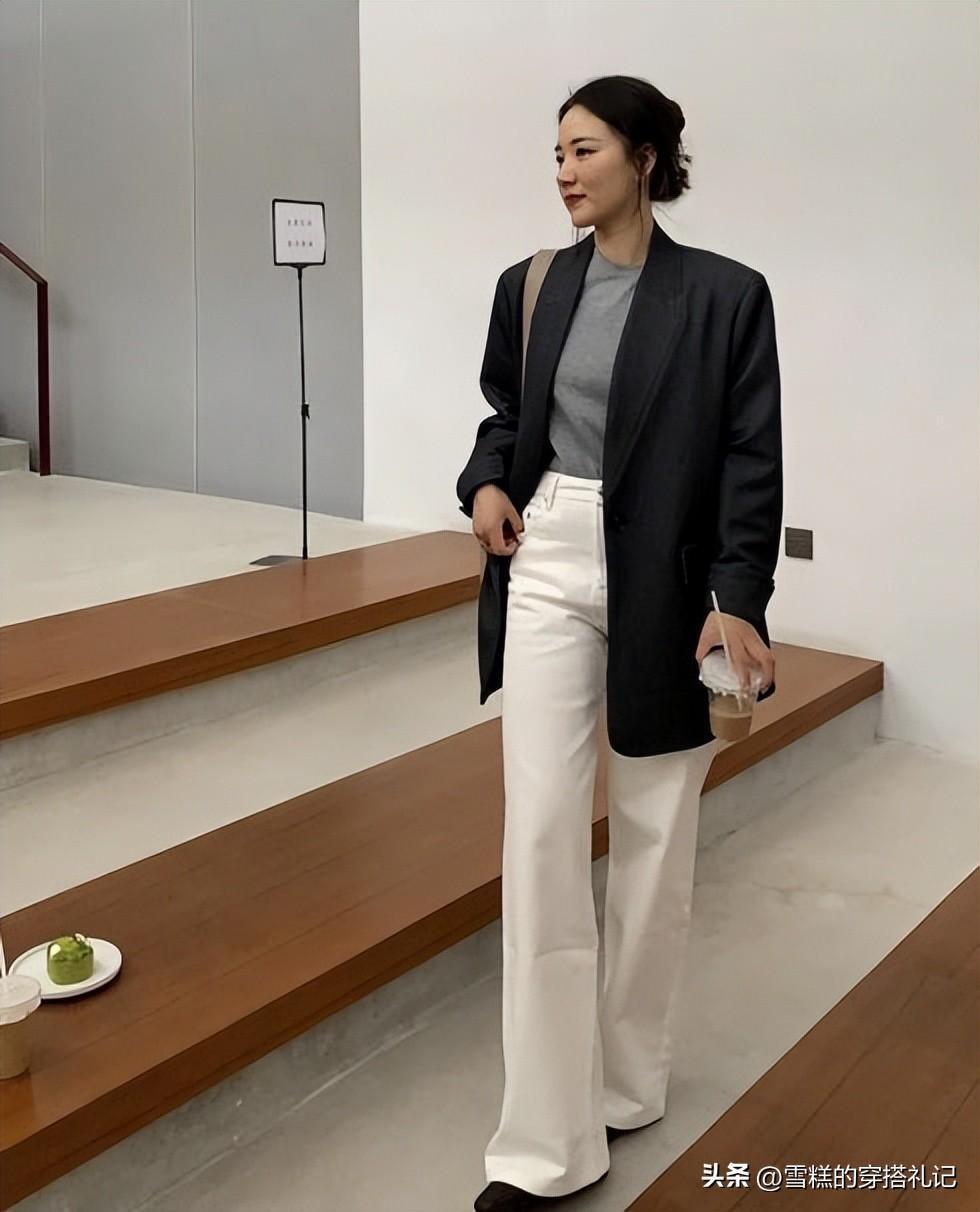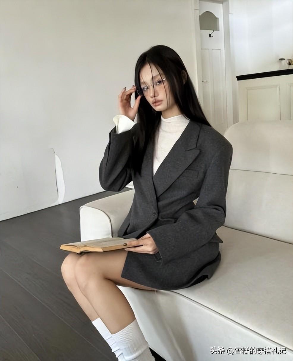 首先是灰色的的西裝搭配色彩低調卻亮眼的豆腐褲,這一套很韓系很慵懶,不管是去圖書館、咖啡廳還是上班通勤都完全沒問題的質感穿搭。