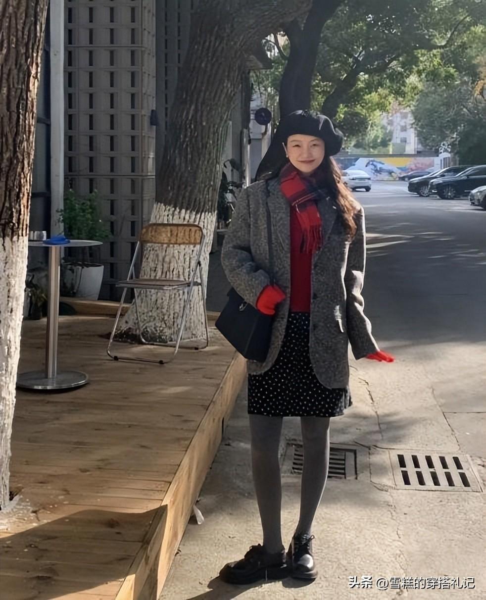 在疊穿搭配時,我們可以利用波點或者格紋元素與之搭配,來提升整體的復古效果。