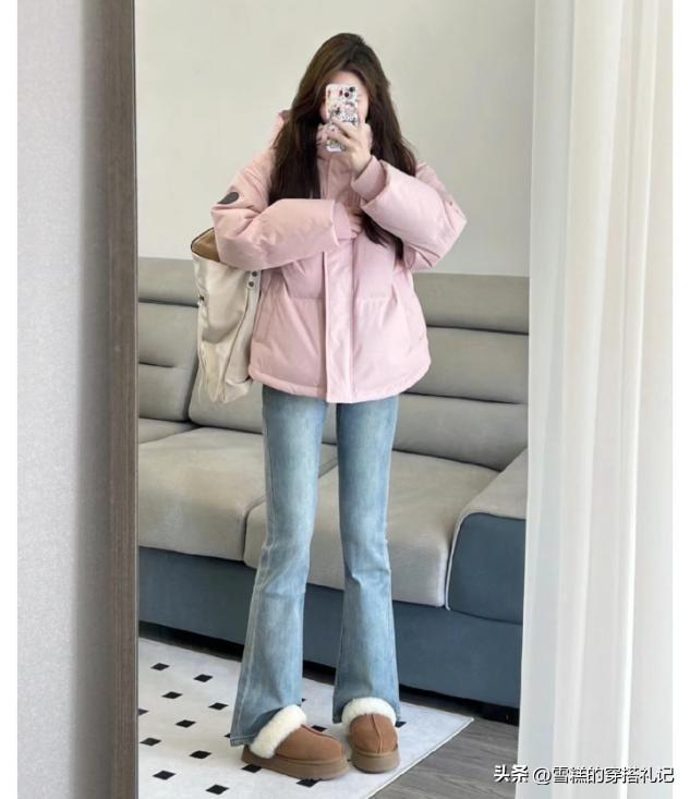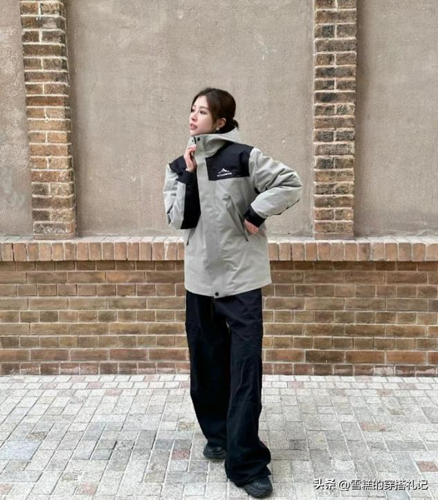 時尚博主們去穿搭羽絨衝鋒衣,用來搭配褲裝的着裝頻率會更多一些,而且最適配的是直筒款式的褲子,寬鬆的褲子版型,肉感包容性很強,而且穿着的舒適度很高,偶爾搭配一條秋褲也完全看不出肉感。