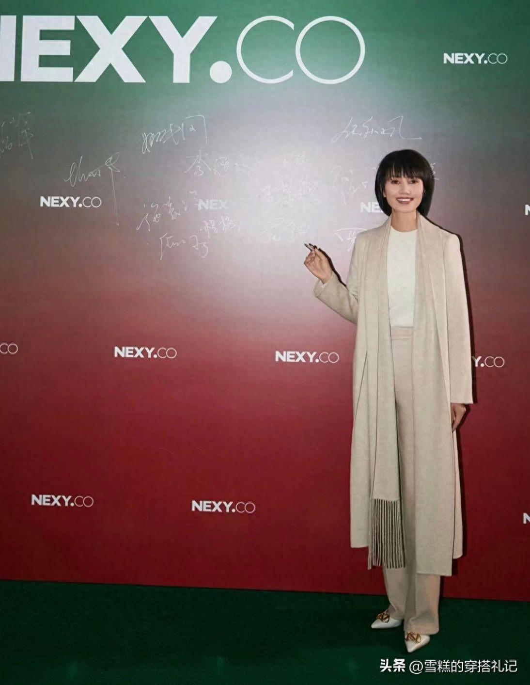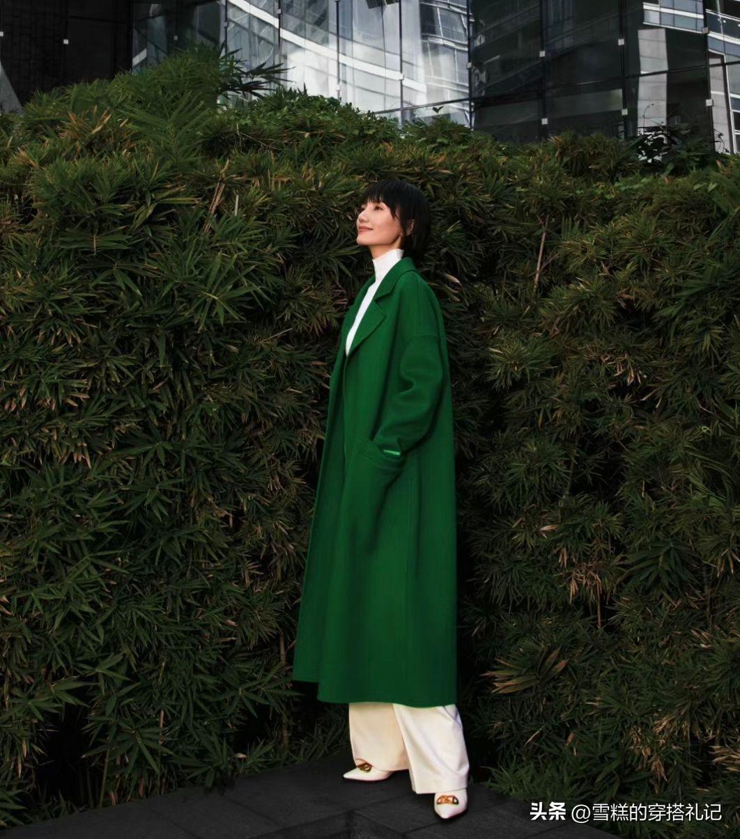 如果覺得黑白灰的搭配過於單一或者是沉悶感比較明顯的話,那麼在這裏就推薦大家可以搭配一些飽和度和明度,這兩個方面都降下來的彩色調,例如像袁泉搭配的這一款深綠色就非常的襯托氣場以及對於身形的顯瘦效果也很明顯,高級又利落。
