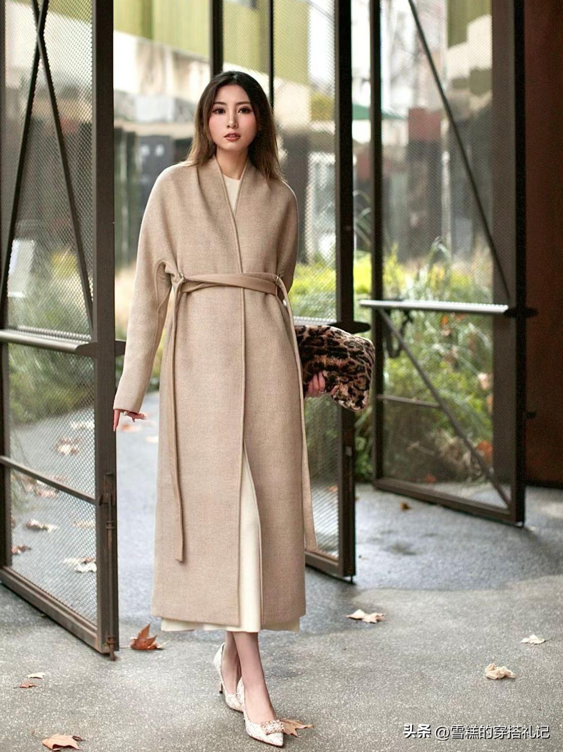 穿的整體呈現效果比較具有溫柔又知性的魅力,那麼這時候的大衣要麼選擇飽和度較低一些的彩色,要麼是直接搭配淺色的系列結合自上而下都爲清新感的穿搭走向。