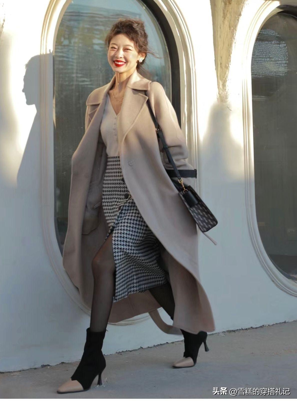 大衣作爲外搭的時候所選擇的裙裝又或者是褲裝都建議大家可以偏長款一些。對於這個年齡階段的女性而言,得體又優雅且穩定的狀態是最爲重要的,比較高腰的長裙又或者是拖地褲的搭配,再結合高跟鞋這樣的顯高效果更彰顯的自然明顯一些。