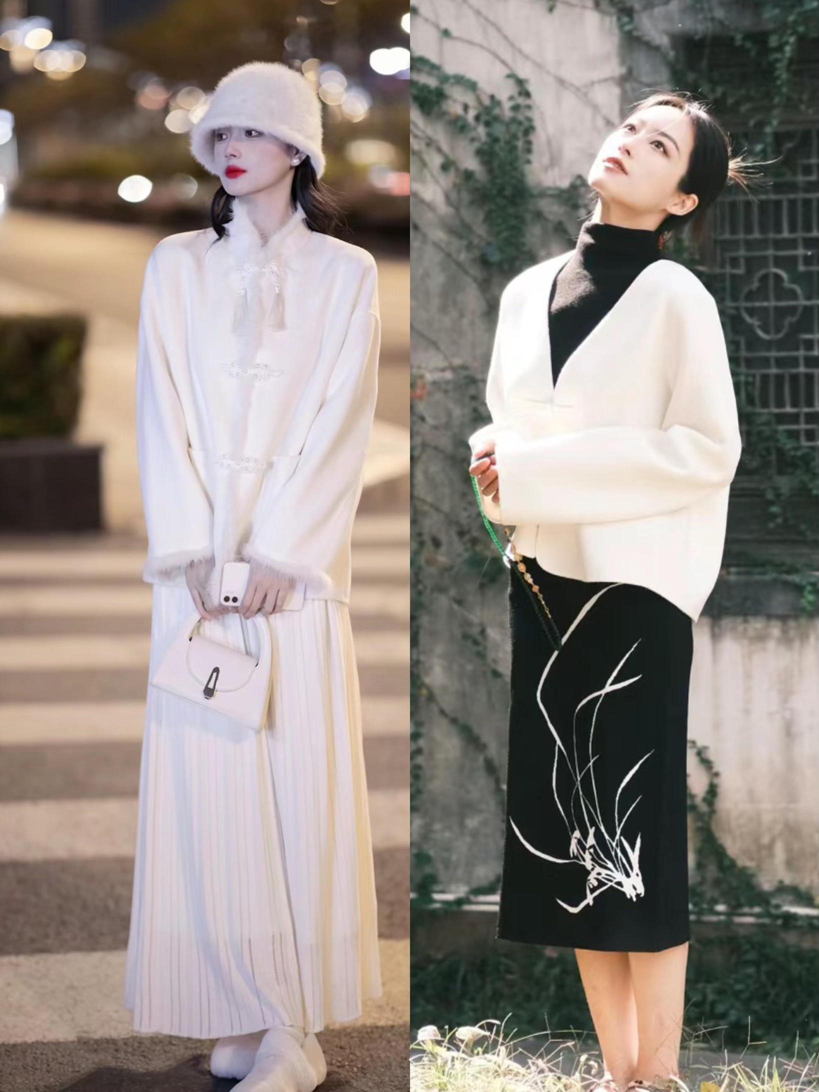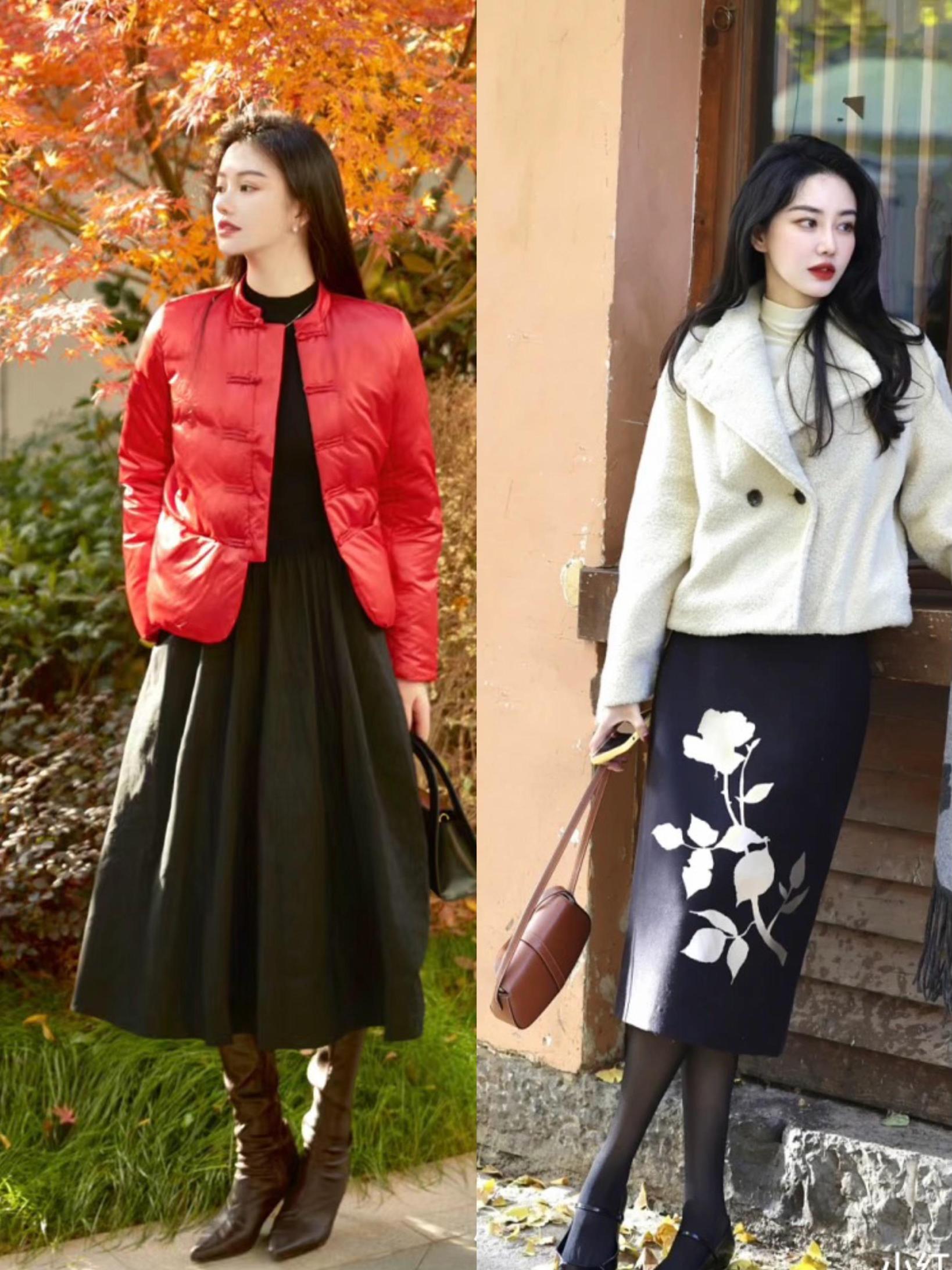 冬天裏我們可以選擇國風的小棉襖,來搭配高腰的半身裙。也可以用極簡風的小外套來搭配國風圖案的半身裙。不管是哪一種組合,都特別的考究耐看。