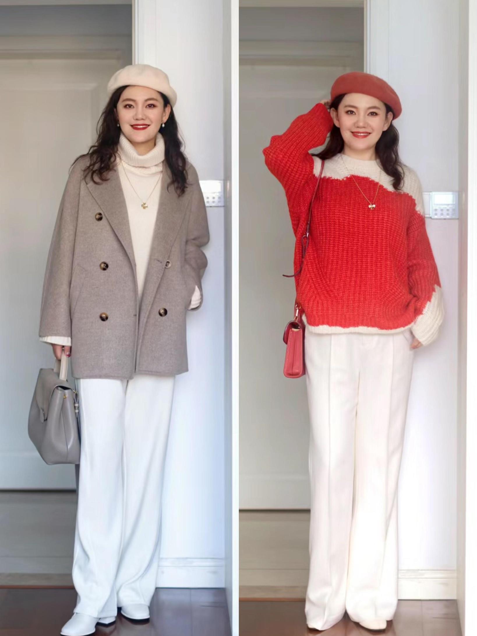 駝色毛呢大衣溫柔又知性,配同色系毛衣穿着很體面。想要豐富整體層次感,可以配高腰的闊腿褲來穿着。一條白色系的高腰闊腿褲、寬鬆且舒適,整體風格大方又優雅。
