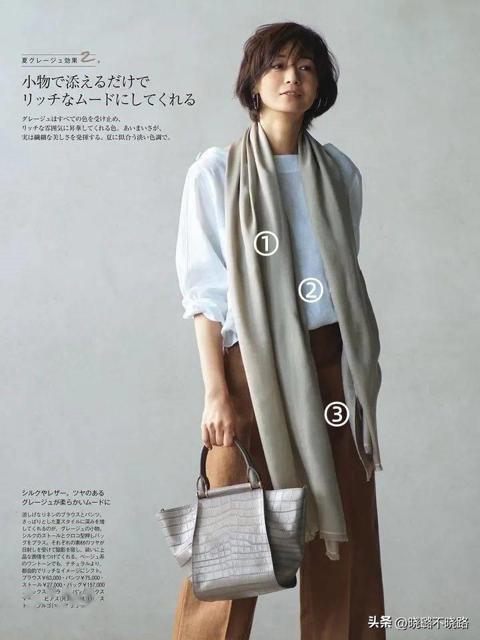 福岡佳子非常喜歡用到的提升品位的配飾之一就是絲巾。各種穿搭搭配各種款的絲巾都很吸睛,真絲的材質自帶高級感,一戴就能顯品味;而且絲巾的圖樣本來就極具辨識度,特別是在搭配極簡風格時,它的亮點更顯高品感。