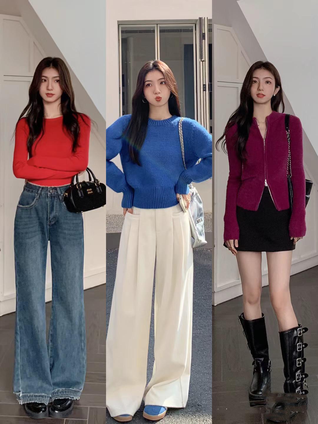 修身的針織衫配上稍微寬鬆一點的直筒牛仔褲,就是典型的韓系穿搭呀。這樣的穿搭模板、風格上更加多變,針織衫的色彩、款式,都可以做出一定的變化。