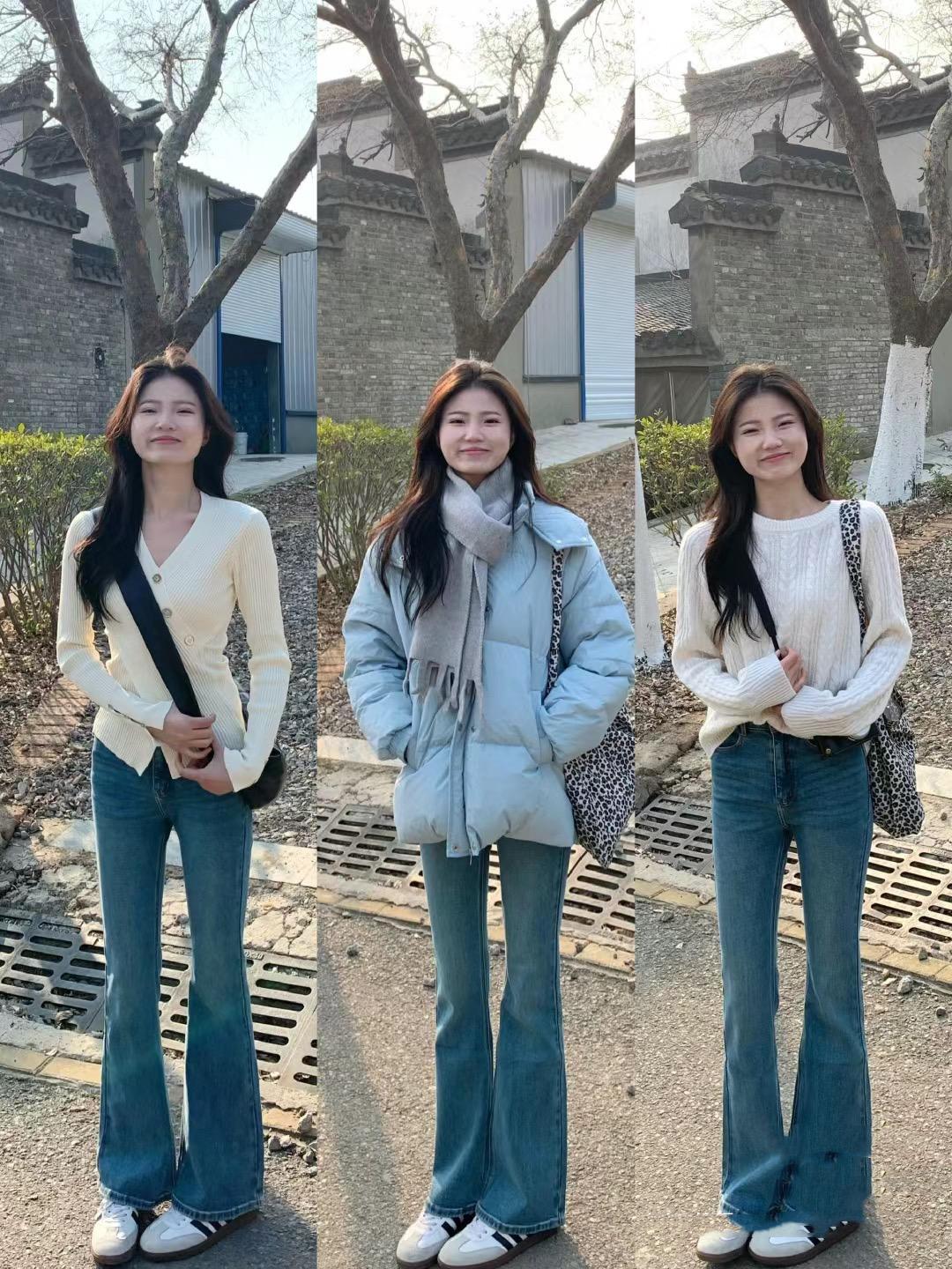 高腰的微喇褲配短款的針織衫/打底衫/羽絨服,都可以壓縮上半身的比例,同時拉伸雙腿的線條、顯得雙腿更加修長。高腰微喇牛仔褲的搭配,也會更加時髦摩登。