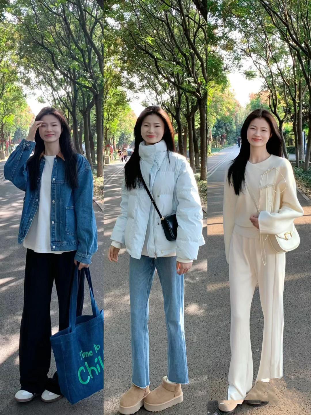 淺藍色豎領羽絨服+淺藍色直筒牛仔褲的搭配,色彩上也是一種順色的組合,簡約、清爽,又時髦顯瘦。尤其是比較硬挺的直筒牛仔褲,還可以拉伸雙腿線條,更加顯高。