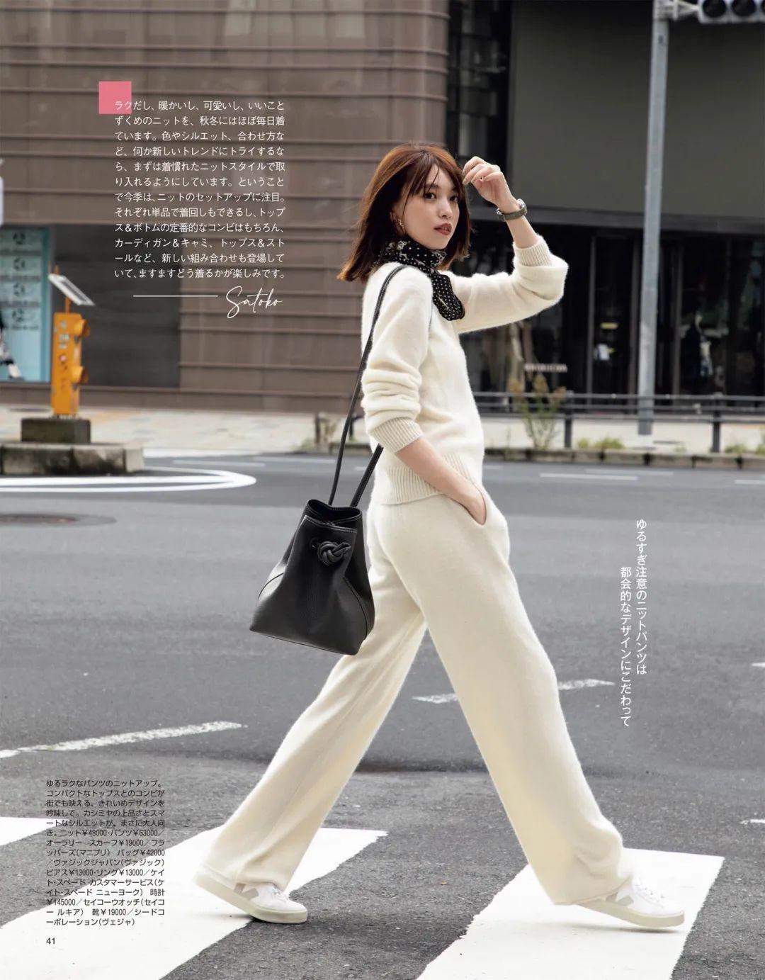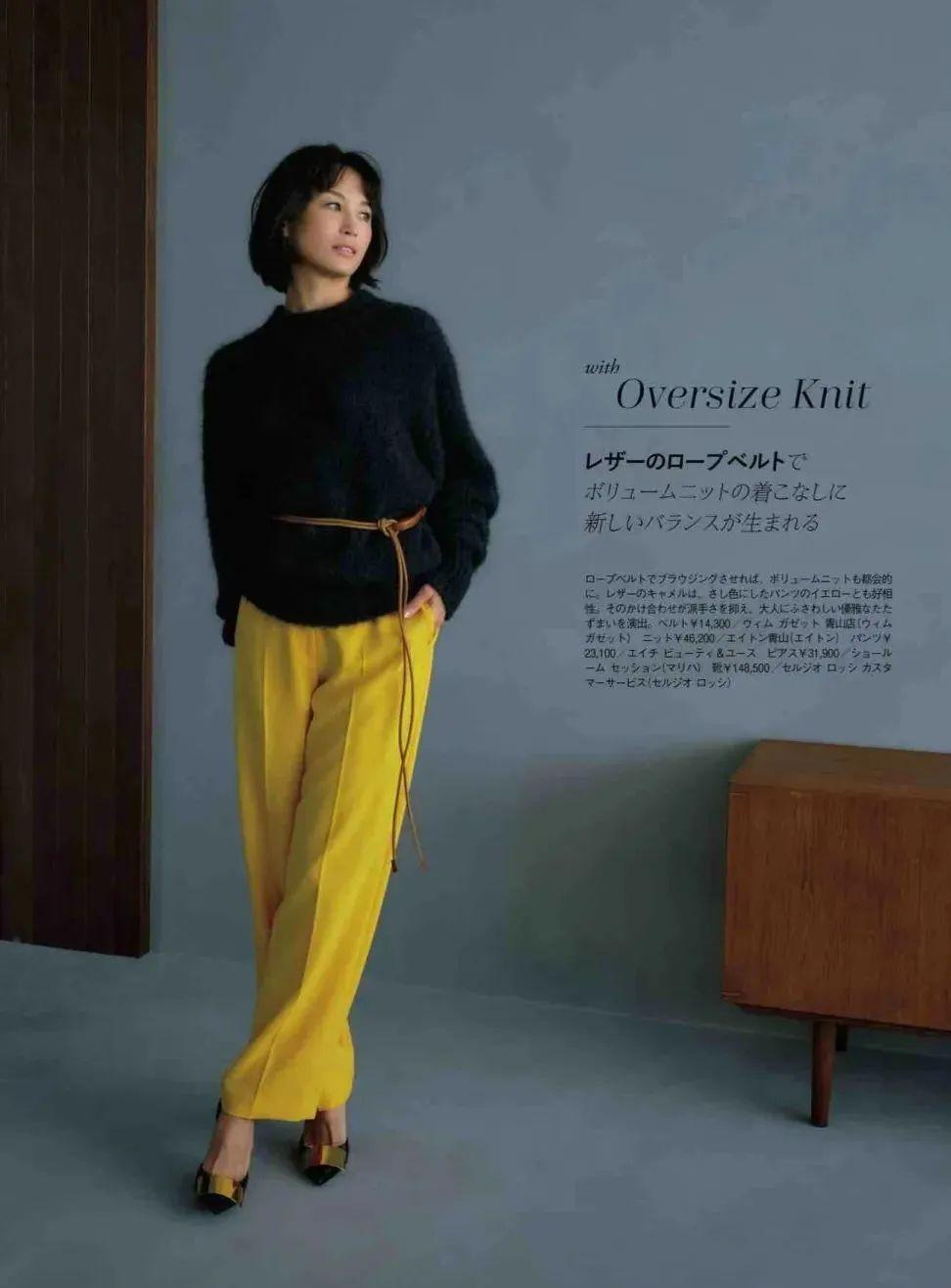 毛衣的款式都是比較顯鬆弛感的,與闊腿褲組合在一起,也極有可能會穿得比較慵懶和拖沓。所以,懂得強調腰線和塑造腰線都是比較關鍵的。