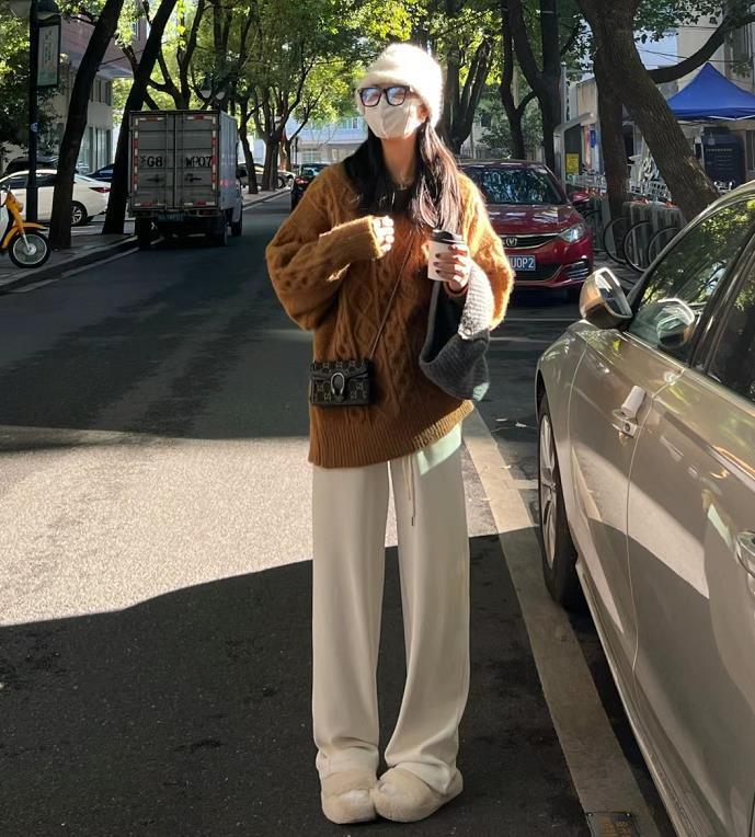 寬鬆大毛衣,穿起來可顯慵懶了,棕色的毛衣自帶復古氣息,搭配米白色闊腿拖地褲,輕鬆就將慵懶風拿捏了。