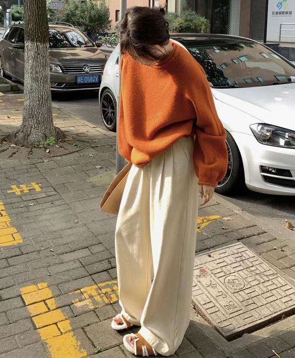 秋冬就是要鑽進軟軟糯糯的毛衣裏,橘色系的毛衣+白色闊腿褲,這麼一套乾淨卻抓眼球,顯白更亮眼。