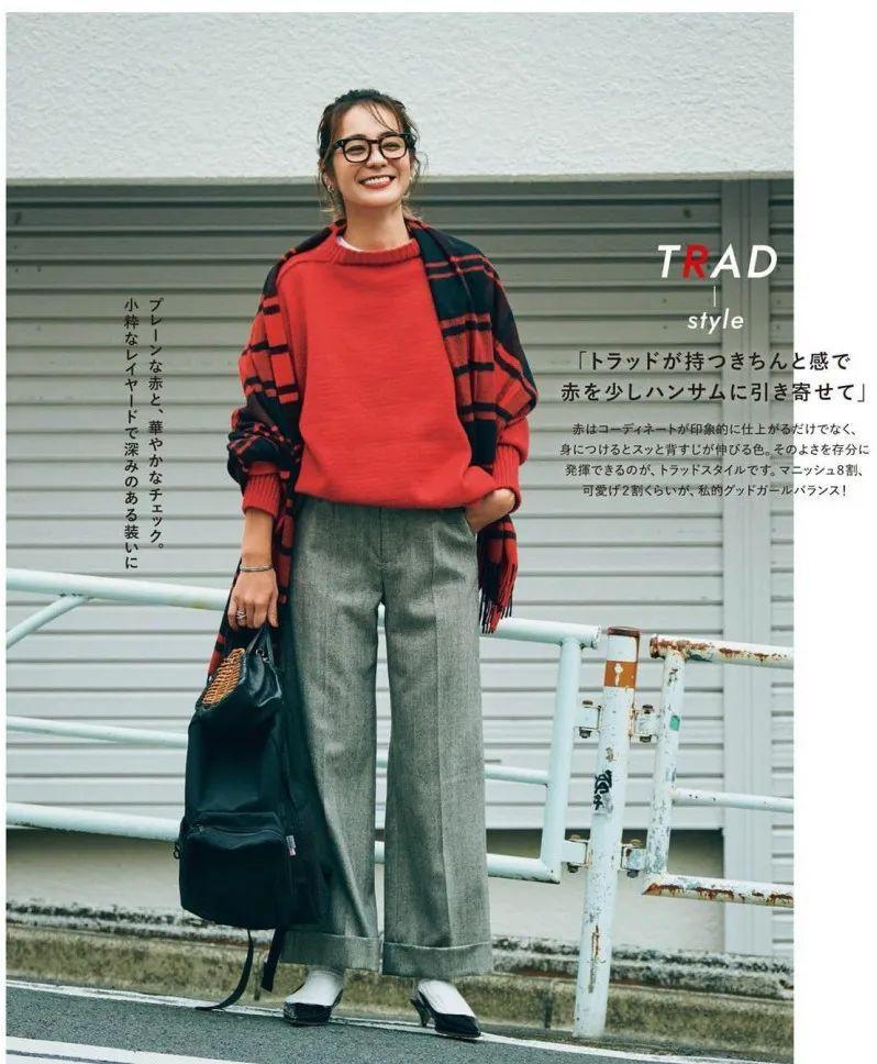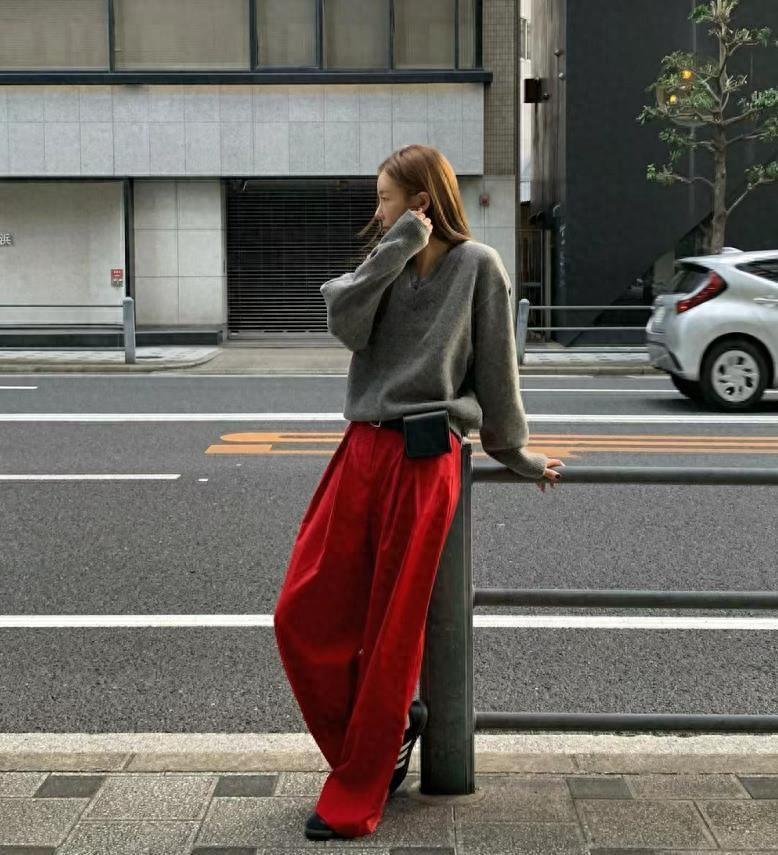 彩色的毛衣很吸睛洋氣,但彩色的闊腿褲卻不是那麼容易駕馭,在沉悶的秋冬季節,很多的穿搭都偏向黑白灰。