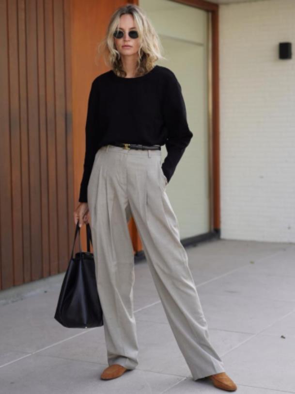還有闊腿褲的版型也是越簡單越好,長度不用太限制,就算是拖地的長度也無懼。因爲褲腳堆疊在鞋面上會顯得更慵懶。