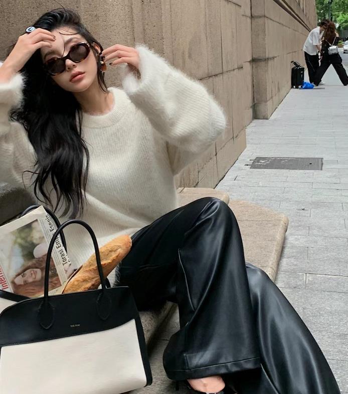 黑白配是最耐看時髦的了,完全不會出錯,被白色的大毛衣包裹着,實在是太舒服了,選擇皮質的闊腿褲相配,又酷又颯。