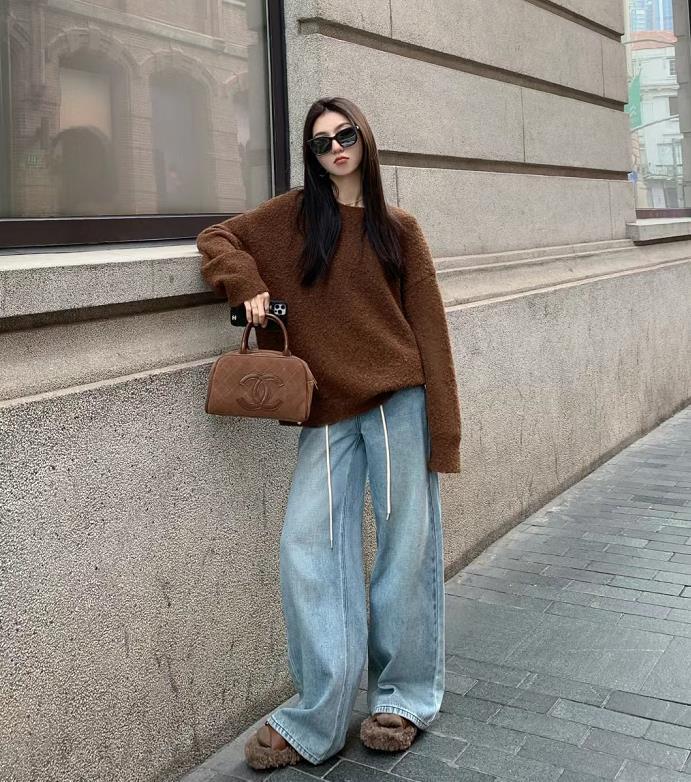 大毛衣+牛仔闊腿褲,喜歡這種隨性的穿搭,鞋子和包包的顏色,巧妙與毛衣進行了呼應,絕了。