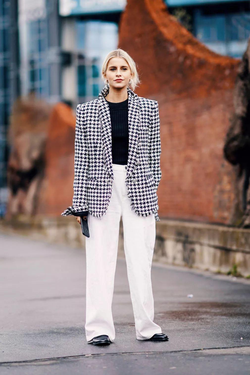 格紋西裝+白褲子,一簡一繁,輕鬆打造出層次感,偏中性風的穿搭,又酷又時髦。