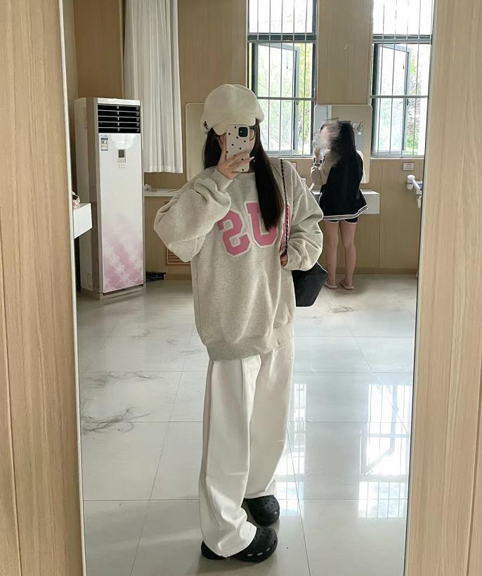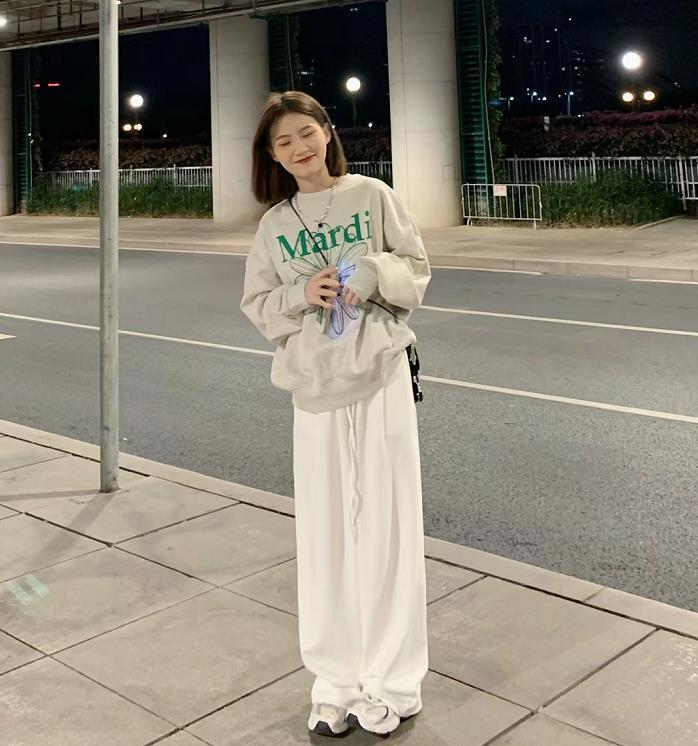 喜歡休閒、隨性範的穿搭,這種穿法也可以稱爲鬆弛感的搭配,今年可流行了,花灰色衛衣+白色休閒拖地褲,簡約乾淨。