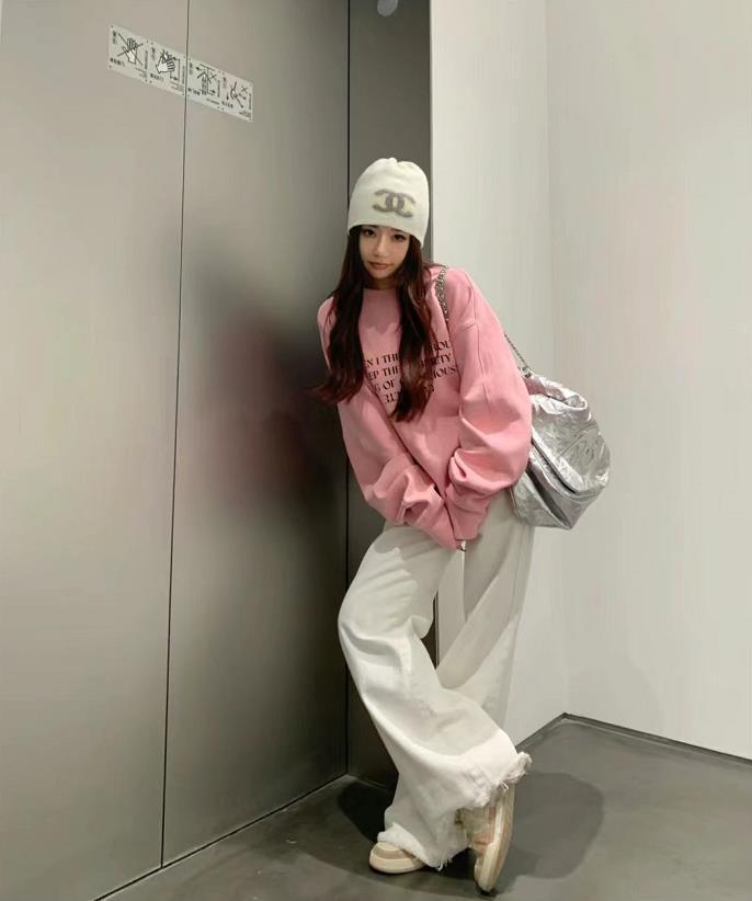 粉色衛衣真的太好看了,低飽和度的淺粉色,完全不會顯得俗氣,還能把膚色襯托得很白皙。搭上一條白褲子,這一套看起來很吸睛,顯嫩又減齡。