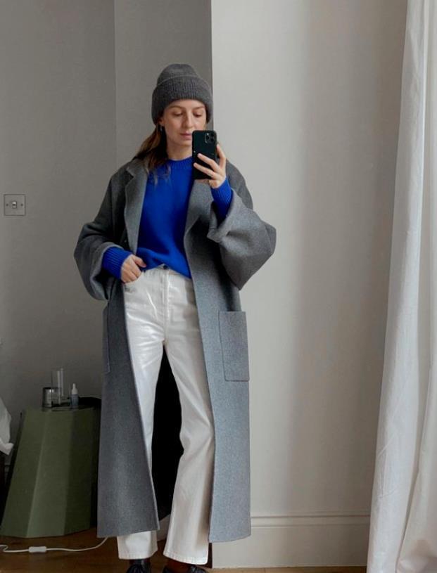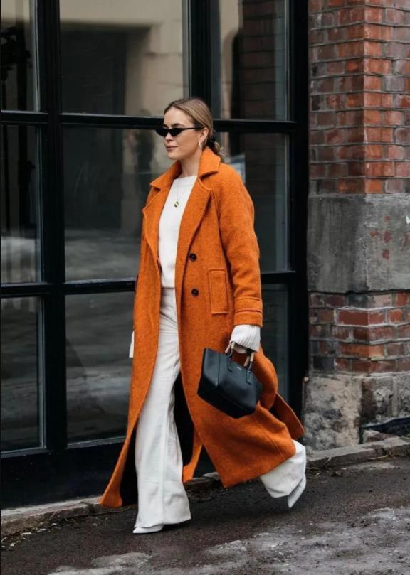 還可以嘗試下彩色長大衣,既能點亮整個穿搭時髦度,又吸睛,與白色褲子相配就不會顯得太豔俗。