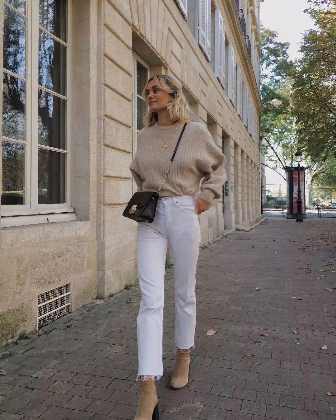 像白褲子這種經典款褲裝,自然是沒有搭配限制的,無論與什麼樣的上衣相配都毫無違和感。搭配毛衣,優雅輕盈又顯隨性,很好展現出女性的氣質和自信。