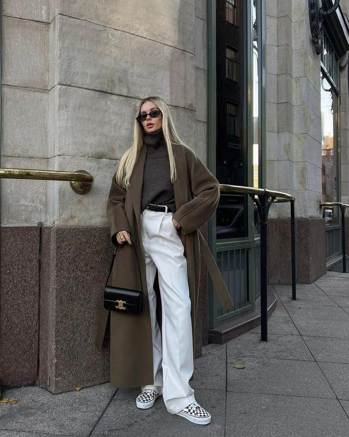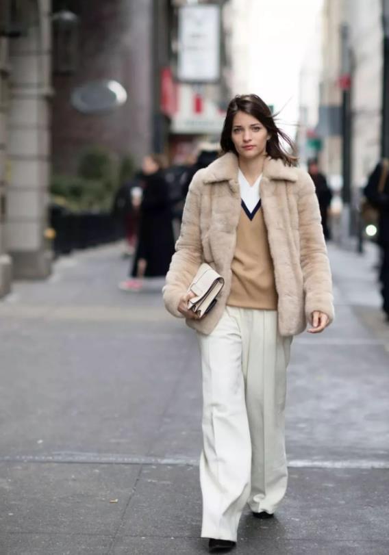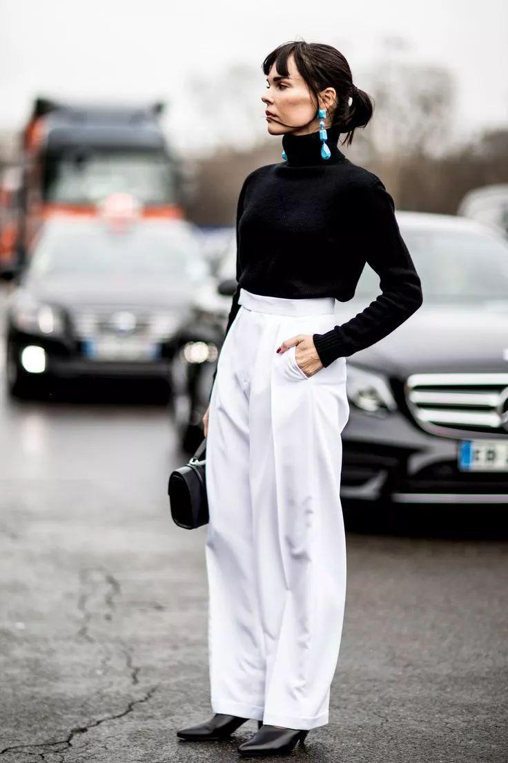 與白色褲子相配,只要選對合適的褲型,就可以穿得利落幹練且不臃腫,白褲子在冬季選擇深色穿搭中,可以起到點亮的作用。