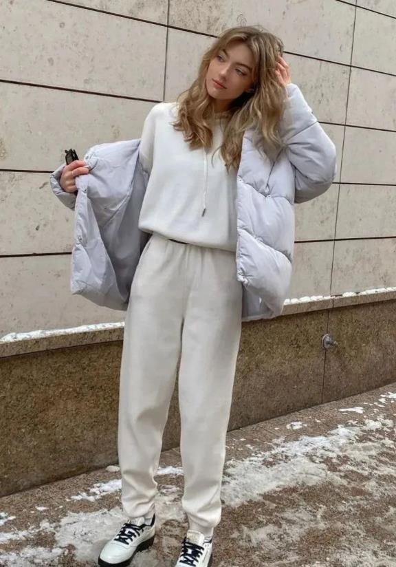 除此之外,羽絨服也是很不錯的選擇,選擇做工精緻的款式,保暖又不失品味,搭配白色褲子,率性灑脫又有型。