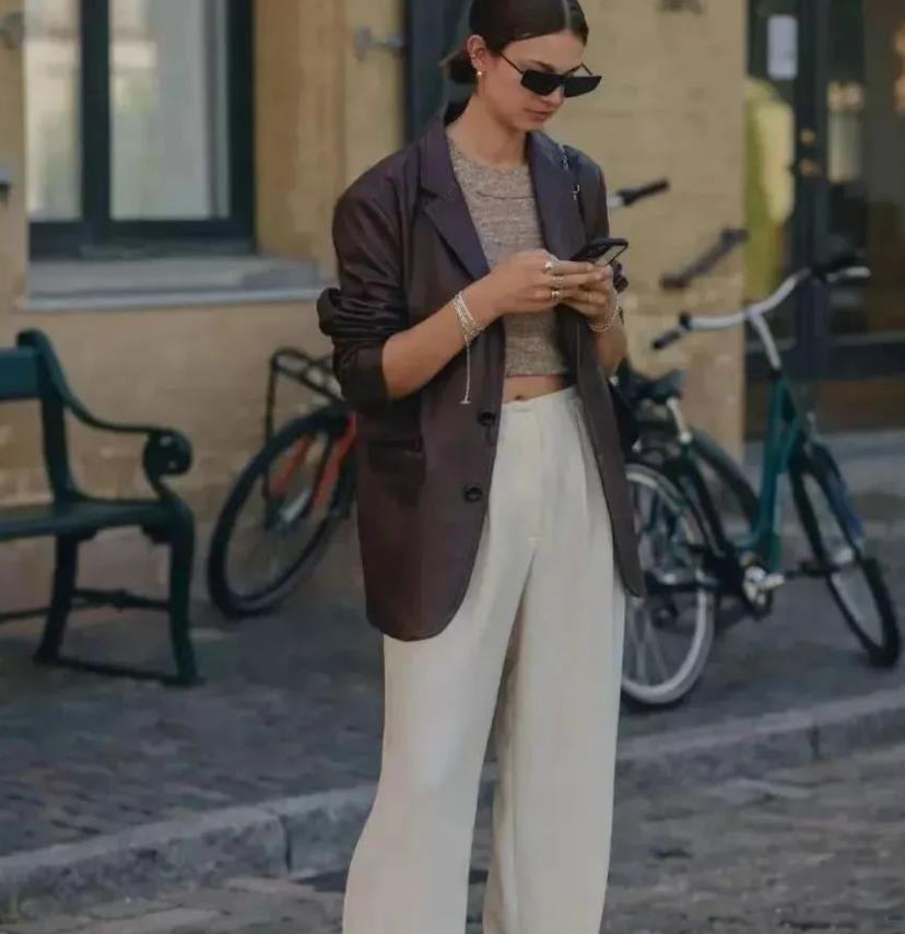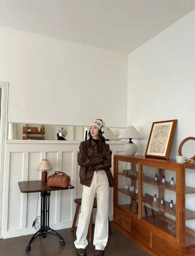 棕色的皮衣和白色褲子相配,就有種很復古的範,整體的穿搭看起來更時髦活潑了。