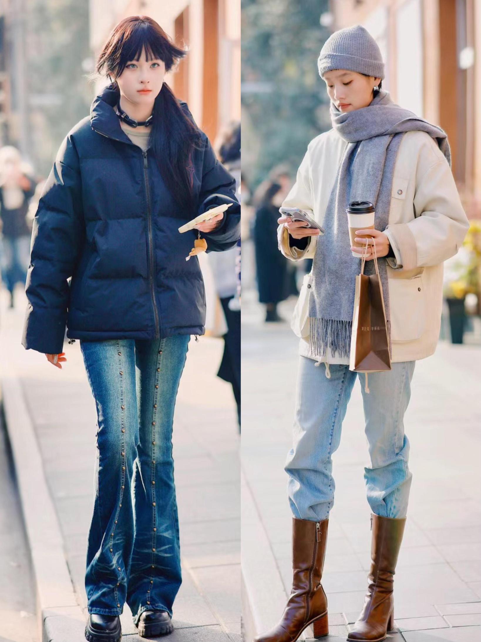 夾克款的羽絨服,搭配了高腰的直筒牛仔褲,上短下長的組合顯得身材比例更加完美。高腰的直筒牛仔褲,稍微寬鬆的版型,對於微胖人羣也會更加友好。