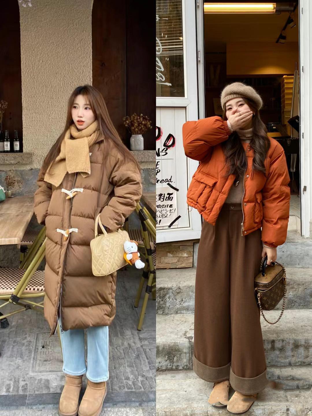 美拉德風格盛行的當下,棕色、焦糖色、駝色,都是非常受歡迎的顏色。棕色羽絨服、南瓜色羽絨服、棕色闊腿褲、駝色雪地靴,都更加應景。
