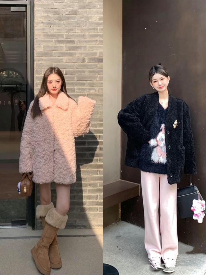 冬天裏的穿搭,沒有必要那麼呆板、我們可以嘗試甜一點的風格。淺粉色的羊羔絨外套、或者淺粉色的闊腿褲,都可以安排起來。